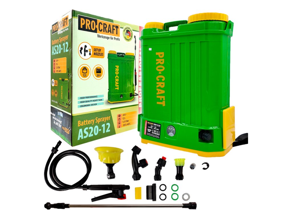AKU postrekovač ProCraft AS20-12 je navrhnutý pre profesionálov aj amatérskych záhradníkov, ktorí hľadajú spoľahlivé riešenie pre postrekovanie, ošetrovanie a dezinfekciu. Vybavený vysokokvalitným čerpadlom s nastaviteľným prietokom, dokáže generovať tlak až do 5 bar, čo zabezpečuje presnú aplikáciu postrekových prostriedkov.