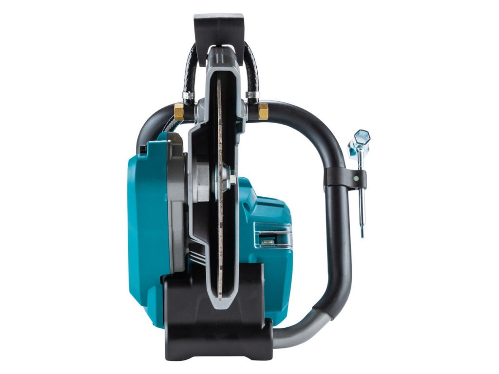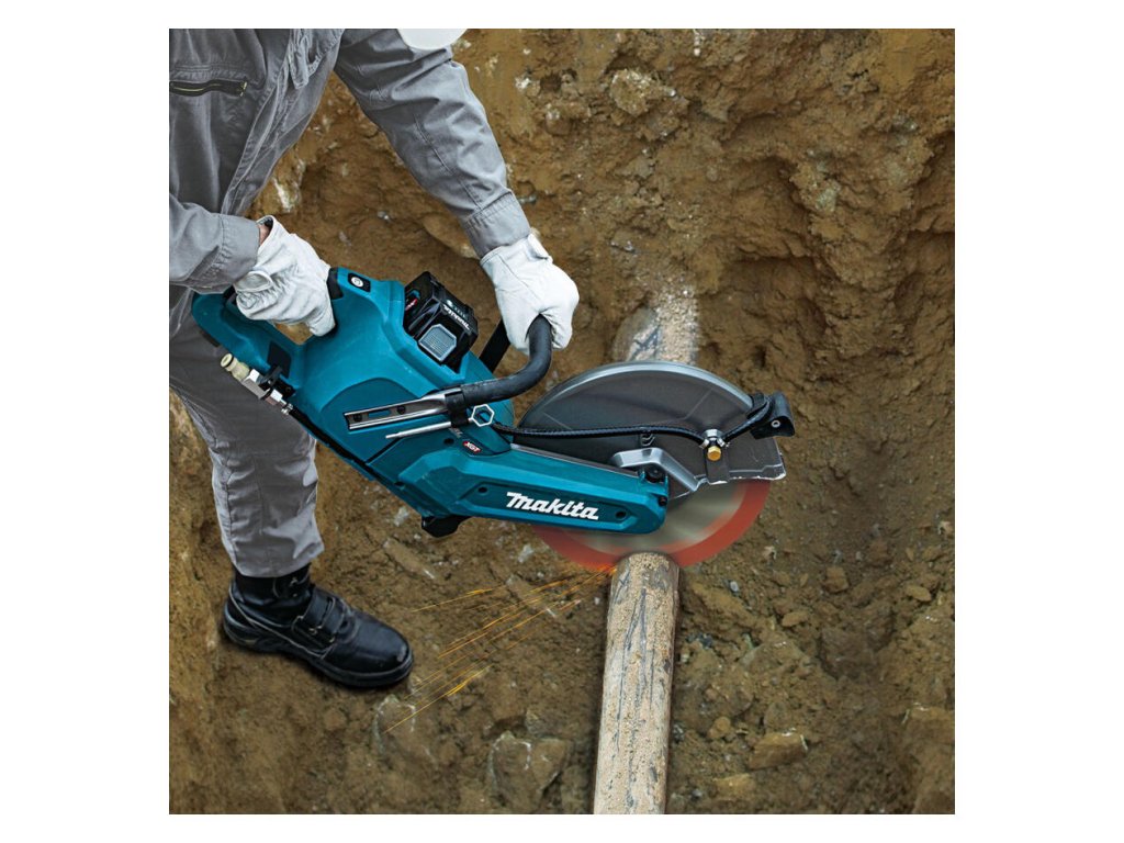 - Výkonná akumulátorová rozbrusovacia píla s priemerom kotúča 305 mm a hĺbkou rezu 121 mm, vybavená prípojkou na vodu.