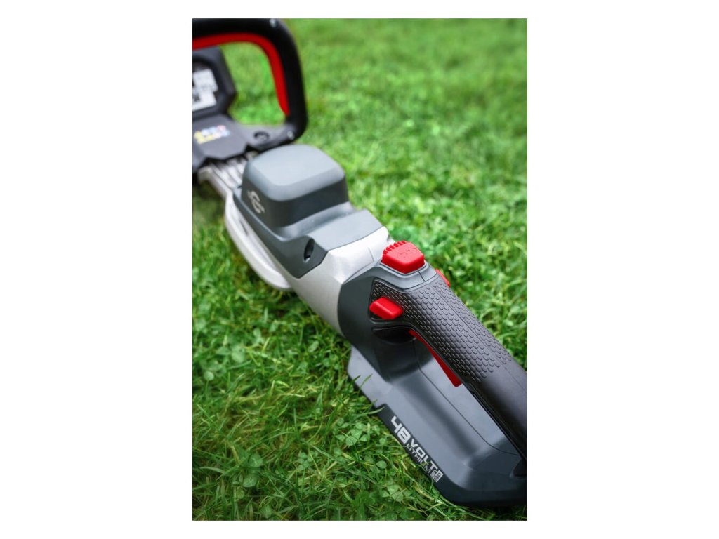 Model Cramer 48HD66 je vybavený dvojitou spúšťou s funkciou spätného chodu, ktorá zaručuje vyššiu bezpečnosť pri používaní. Tento mechanizmus pomáha predchádzať náhodnému zapnutiu a zaisťuje, že rezné prvky sa rýchlo zastavia v prípade potreby.
