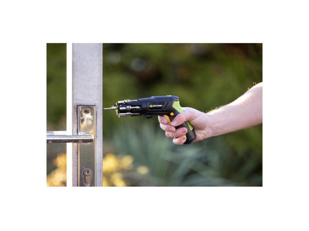 Už nikdy nehľadajte bity po vreckách! Akumulátorový skrutkovač FIELDMANN FDS 10102-A disponuje hlavicou so šiestimi bitmi upevnenými na otočných ramenách. Požadovaný nástroj jednoducho vyklopíte a okamžite môžete začať so skrutkovaním v domácnosti. Tento skrutkovač Fieldmann je navyše vybavený otočnou rukoväťou, vďaka ktorej sa dostanete do hlbokých skriniek i úzkych medzier za radiátormi.Kompaktná sila pre domáce projekty
