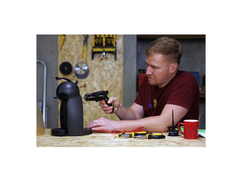 🔹 Akumulátorový skrutkovač s integrovaným zásobníkom🔹 6x skrutkovací bit na ramenách