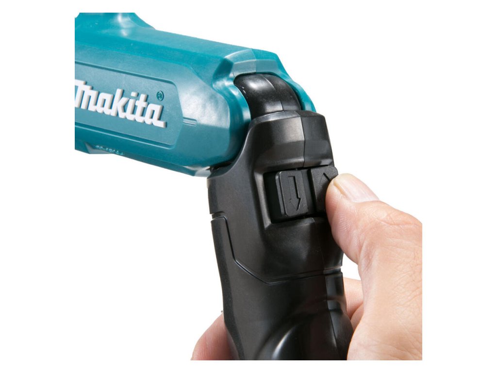 Ako zmením tvar rukoväte? Na tele skrutkovača je kĺb, ktorý po stlačení poistky umožní narovnať stroj do jednej línie.