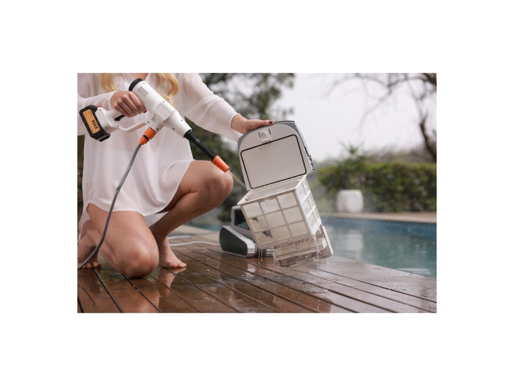 Dvojnásobný sací výkon sa dosahuje vďaka dvom odstredivým čerpadlám, ktoré prefiltrujú až 420 litrov vody za minútu a účinne čistia dno, steny a vodnú čiaru.