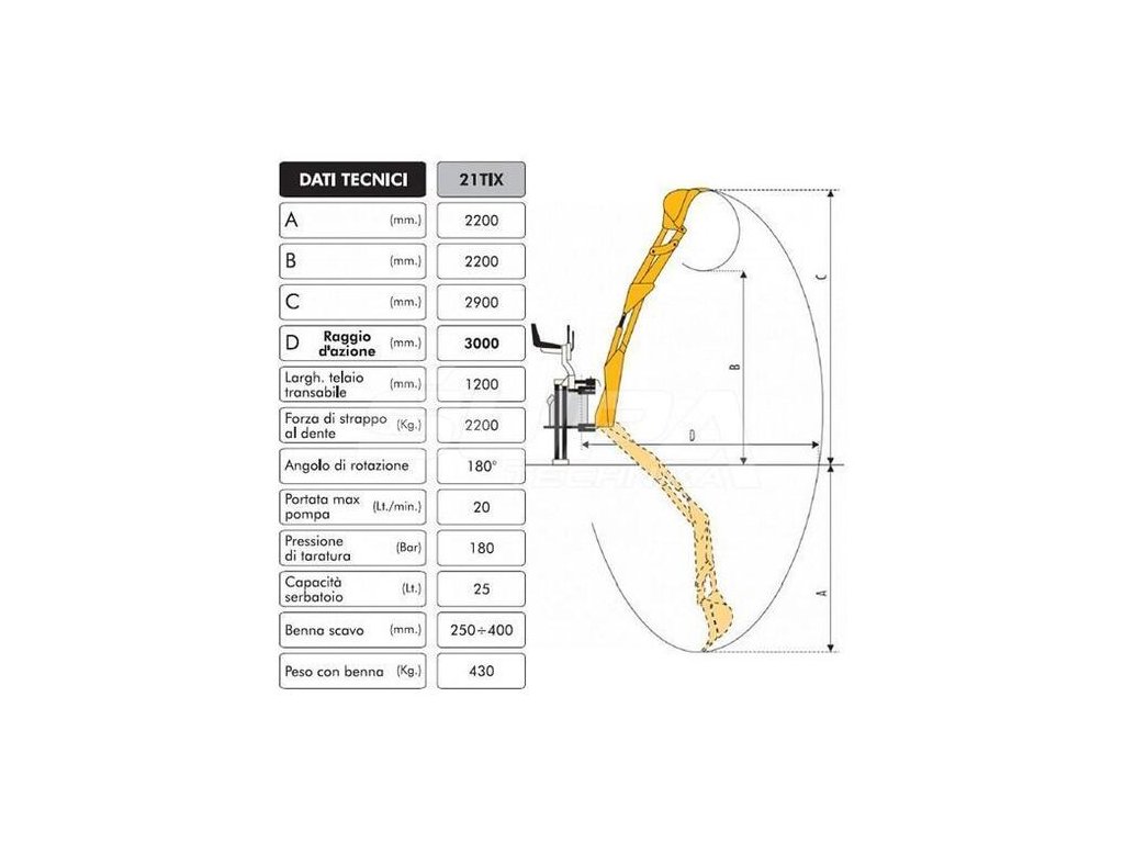 Mohutný zadný podkop Tifermec série L - L21 TIX, s ramenom posuvným po ráme s hydraulickým zámkom a otočným o 180°. Nezávislé okruhy pre bočné sklopné hydraulické stabilizátory so