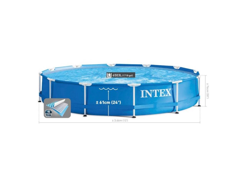 Užite si hodiny vonkajšej zábavy s bazénom Intex Metal Frame 28212 s rozmermi 3,66 x 0,76 m. Vyrobený je z 3-vrstvového odolného materiálu SUPER-TOUGH odolného proti prepichnutiu. Pozinkovaná konštrukcia s práškovým nástrekom zaisťuje vysokú odolnosť. Technológia Hydro Aeration poskytuje zlepšenú cirkuláciu a filtráciu, zlepšenú čírosť vody a zvýšený počet záporných iónov na vodnej hladine. Kapacita vody je 6 503 litrov (90 %).