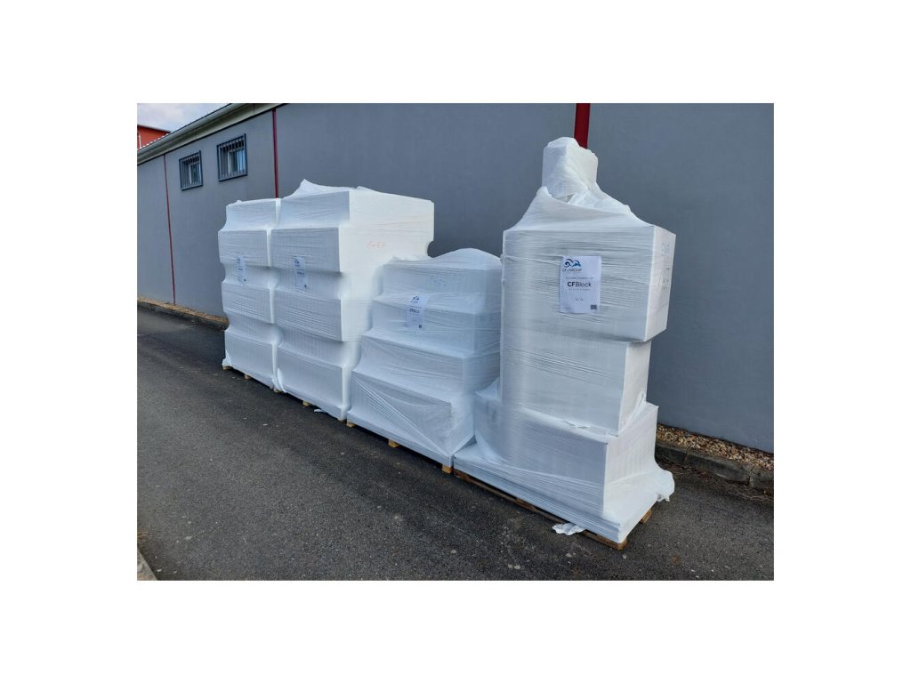 Polystyrénové bloky sú typu PS 25 (25 kg materiálu na 1 m3), majú bielu farbu a rozmery 1,25 x 0,375 x 0,25 m.