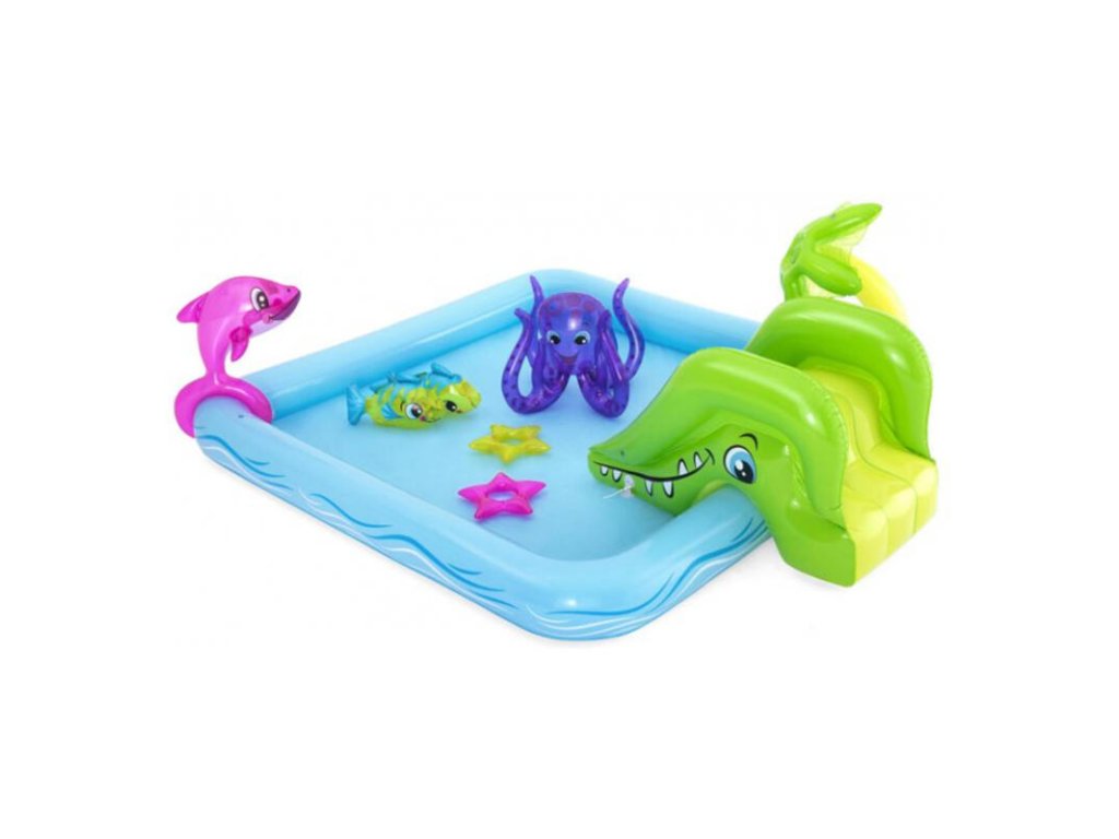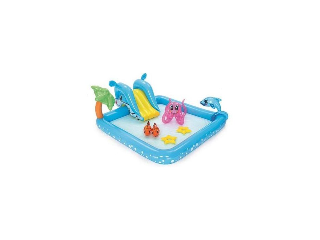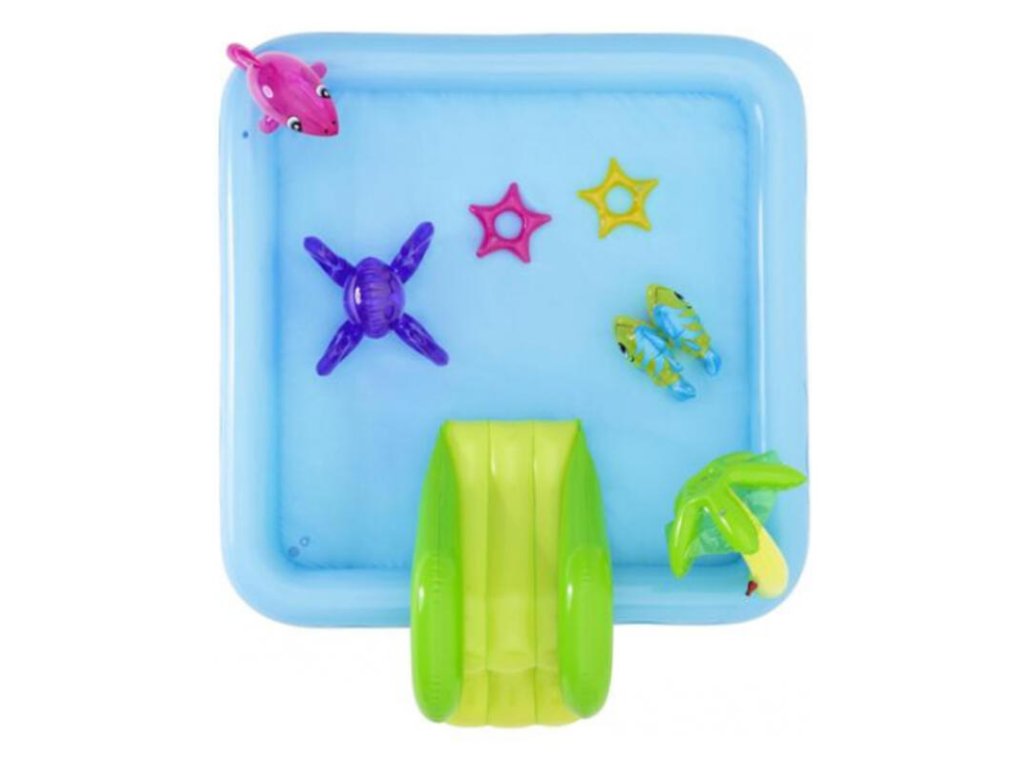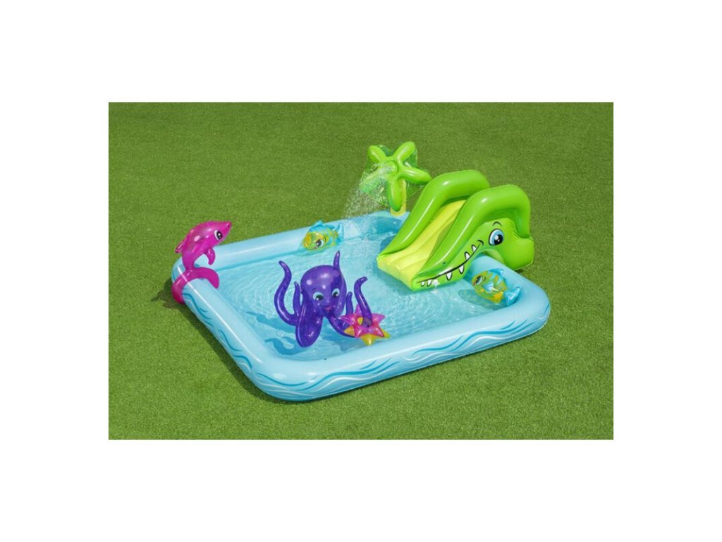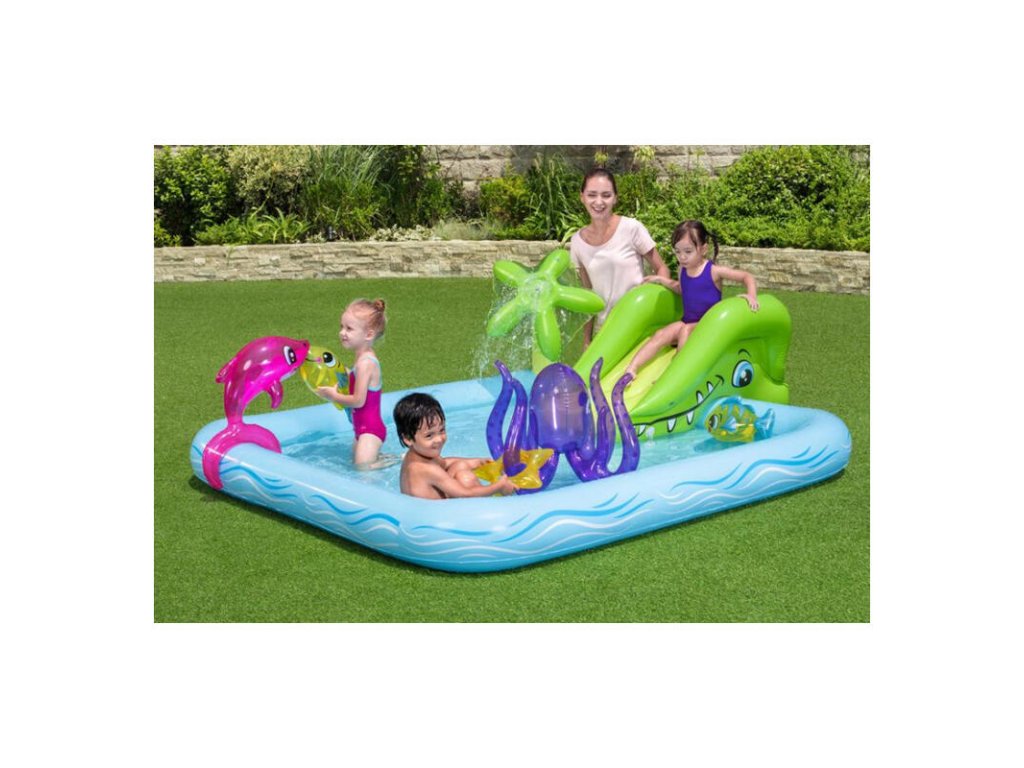 Kúpte sa spolu s morskými živočíchmi v Bestway Fantastic Aquarium bazéne! Vhodné pre deti staršie ako 2 roky. Deti zažijú zábavné kúpanie s delfínmi, klaunmi a chobotnicami. Navyše si môžu zahádzať pribalené krúžky na chápadlá chobotnice! Pripojte záhradnú hadicu a palma bude na deti striekať vodu pre ďalšiu zábavu a dodatočné osvieženie, keď sa hrajú na slnku.