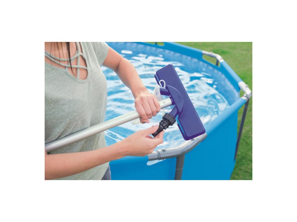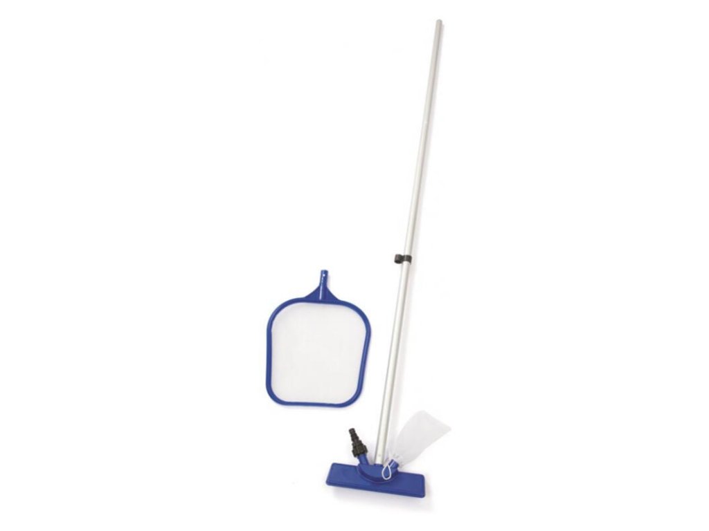 Súprava na údržbu bazéna Bestway® FlowClear™ 58013 zahŕňa ľahkú tyč s vymeniteľným vsávacím a zberacím nadstavcom. Vysávač disponuje jednodielnou čistiacou hlavou a opakovane použiteľným vreckom na odpad. Pred použitím ho stačí pripojiť k záhradnej hadici.