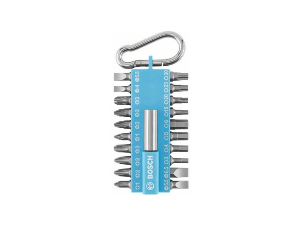 21-dielna sada skrutkovacích bitov s karabínkou (svetlomodrá) ; Praktická sada 20 bežných skrutkovacích bitov s jedným magnetickým univerzálnym držiakom. Vďaka pevnej karabínke, ktorá sa dá ľahko pripnúť k nohaviciam alebo vreckám, sú dôležité bity počas práce vždy na dosah.; Rýchly prístup k bitom.; Pevná karabínka na pripojenie sady k nohaviciam alebo vrecku na náradie.; Skrutkovacie bity na skrutkovanie najbežnejších skrutiek s hlavami Phillips, Pozidriv, Torx, drážkovými a šesťhrannými hlavami.; Vhodné pre všetky bežné značky elektrických nástrojov a ručné skrutkovače.