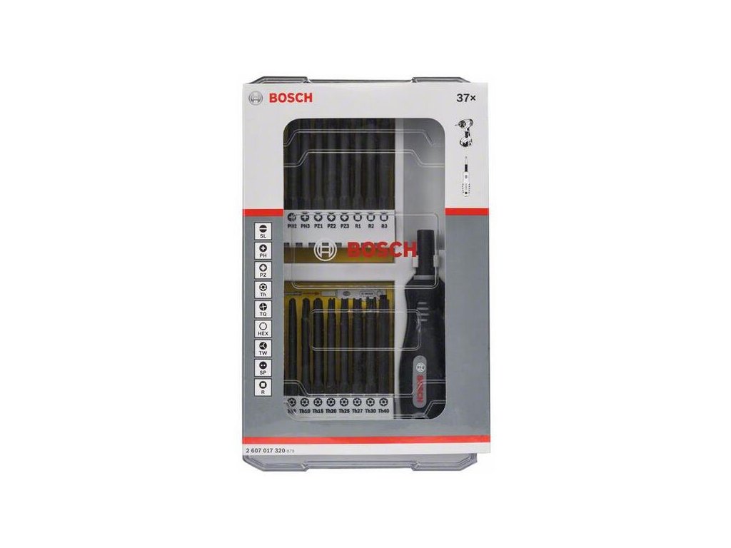 Bosch 37-dielna sada skrutkovačov rukoväťou PH, PZ, SL, TH, TQ, H, TW, SP, a držiakom bitov 2607017320