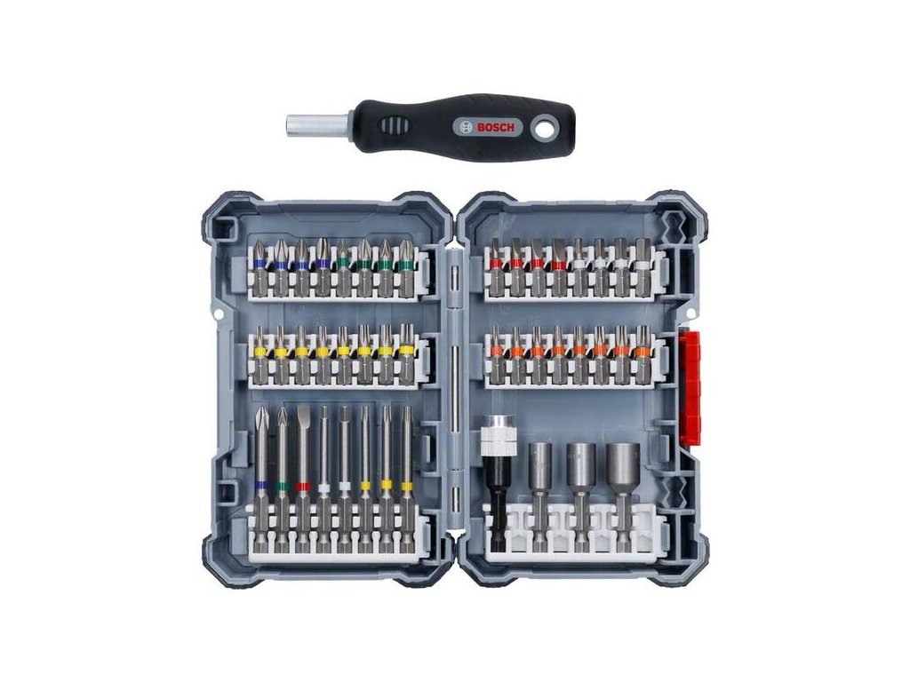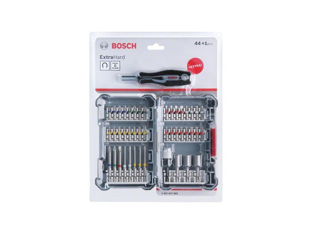 Robustné a kompatibilné bity vyrobené z modifikovanej ocele S2 procesom optimalizovaného tepelného spracovania. Bity sú farebne označené pre okamžitý prehľad a rýchle identifikovanie vhodného typu bitu. Sada 45 ks bitov so skrutkovacími bitmi a nástrčnými kľúčmi Extra Hard sa dodáva v praktickej a robustnej kazete umožňujúcej dobrú prehľadnosť i bezpečné uloženie a prenos. Bezpečná zámka a posilnené rohy kazety Pick and Click chránia príslušenstvo i v tých najnáročnejších pracovných podmienkach. Kufrík je súčasťou systému Bosch Pick and Click, ktorý umožňuje individuálne zostaviteľné súpravy príslušenstva, čím vznikajú kolekcie bitov prispôsobené potrebám. Drážky na zacvaknutie zaisťujú jednotlivo zakúpené balenia bitov, čo umožňuje vytvorenie kolekcie prispôsobenej potrebám a jednoduchú výmenu starých balení.