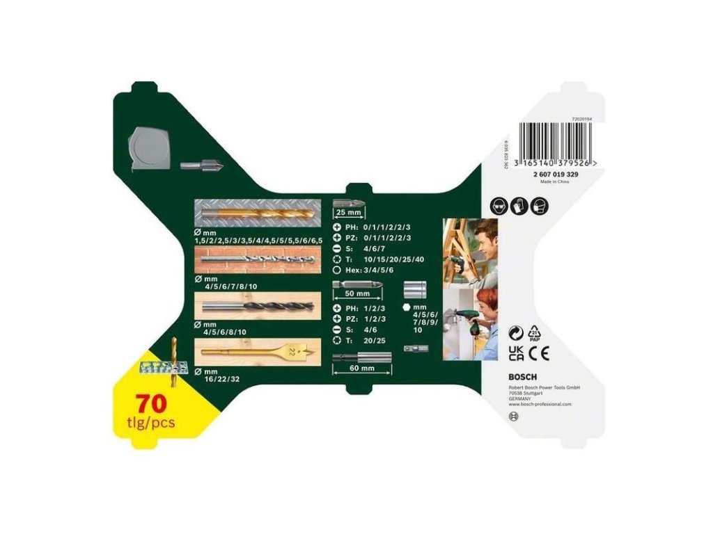 Obsah: | 11 vrtákov do kovu HSS-TiN, Ø 1,5 – 6,5 mm 6 vrtákov do muriva, Ø 4 – 10 mm 5 vrtákov do dreva, Ø 4 – 10 mm 3 frézovacie vrtáky s povlakom TiN, Ø 16/22/32 mm 24 skrutkovacích bitov, D = 25 mm PH 0/1/1/2/2/3 PZ 0/1/1/2/2/3 S 4/6/7 HEX 3/4/5/6 T 10/15/20/25/40 10 skrutkovacích bitov, D = 50 mm PH 1/2/3 PZ 1/2/3 S 4/6 T 20/25 7 maticových nadstavcov, Ø 4/5/6/7/8/9/10 mm 1 adaptér na maticové nadstavce |