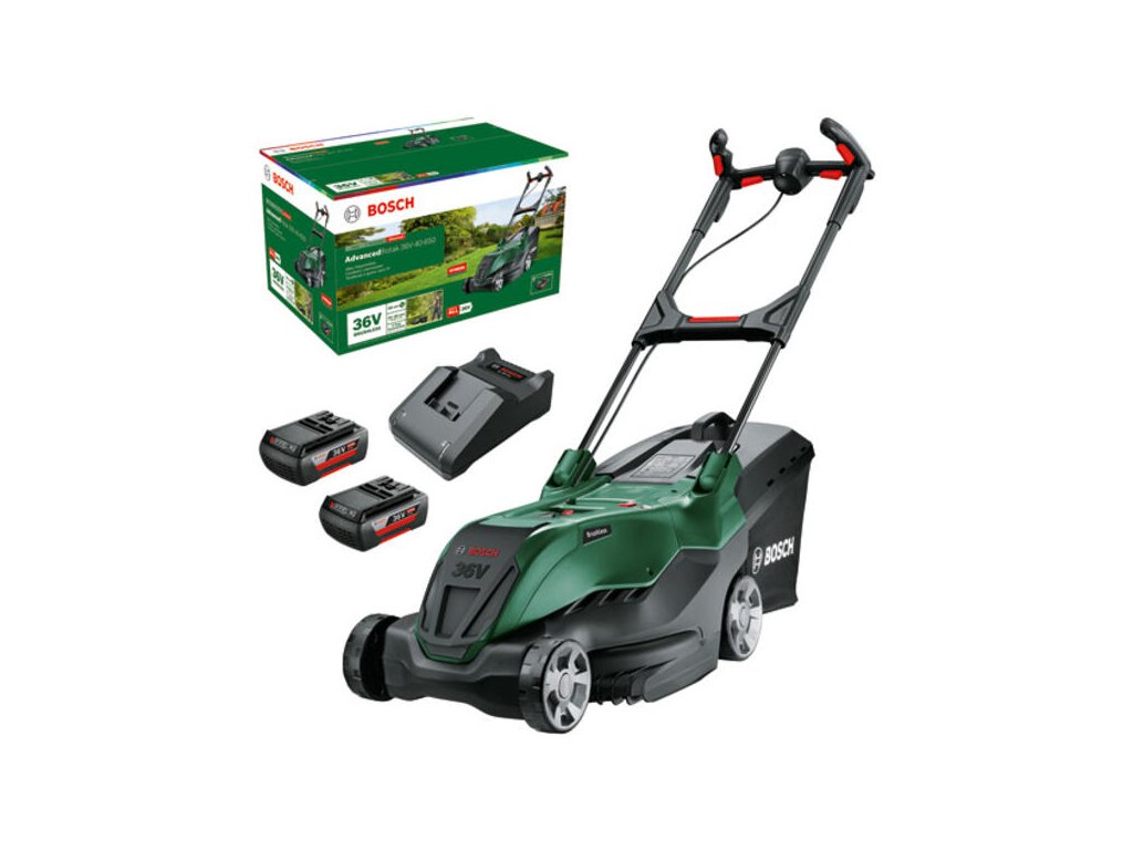 Akumulátorová kosačka AdvancedRotak 36V-40-650; Výkonná akumulátorová kosačka na excelentné kosenie a vynikajúci zber trávy; Vynikajúci výkon kosenia a dlhšia životnosť vďaka bezuhlíkovému motoru; Convenient maneuvering and easy storage thanks to the Ergoflex handles with Ergoslide; Vysokokvalitný látkový zberný kôš na trávu s indikátorom naplnenia; Technológia Syneon zaručuje optimálny výkon a maximálnu dobu prevádzky; Kompatibilné s akumulátorom Bosch 36V POWER FOR ALL; 2 akumulátory 36 V 2,0 Ah; Nabíjačka AL 36V-20