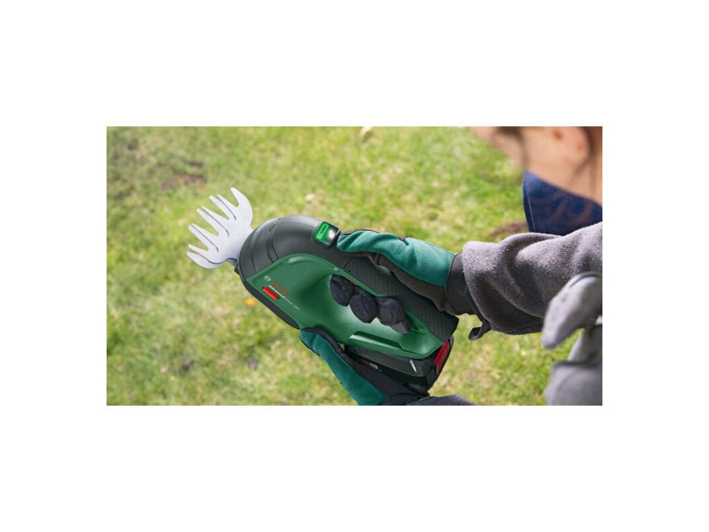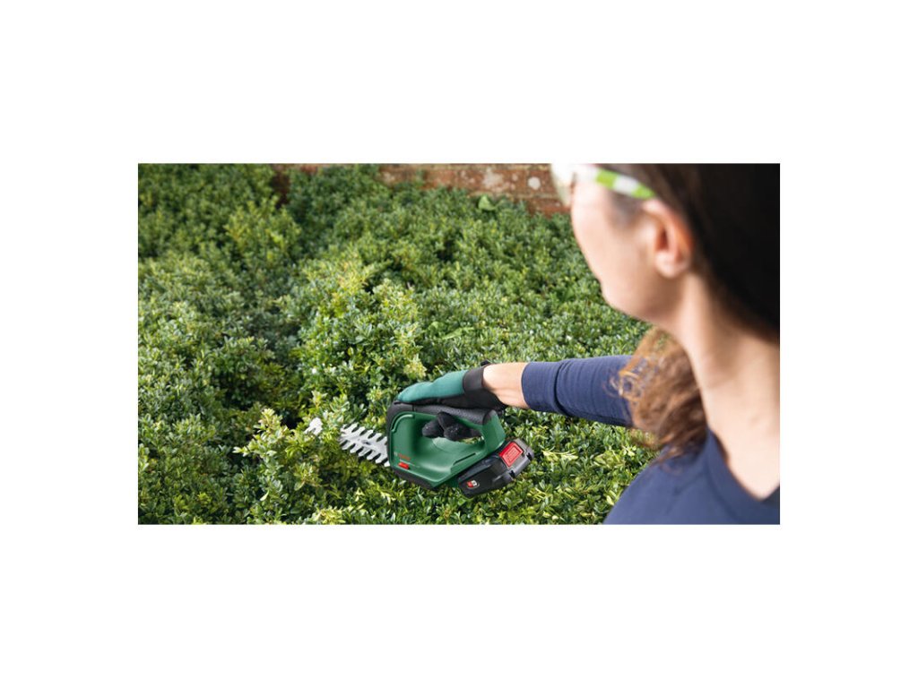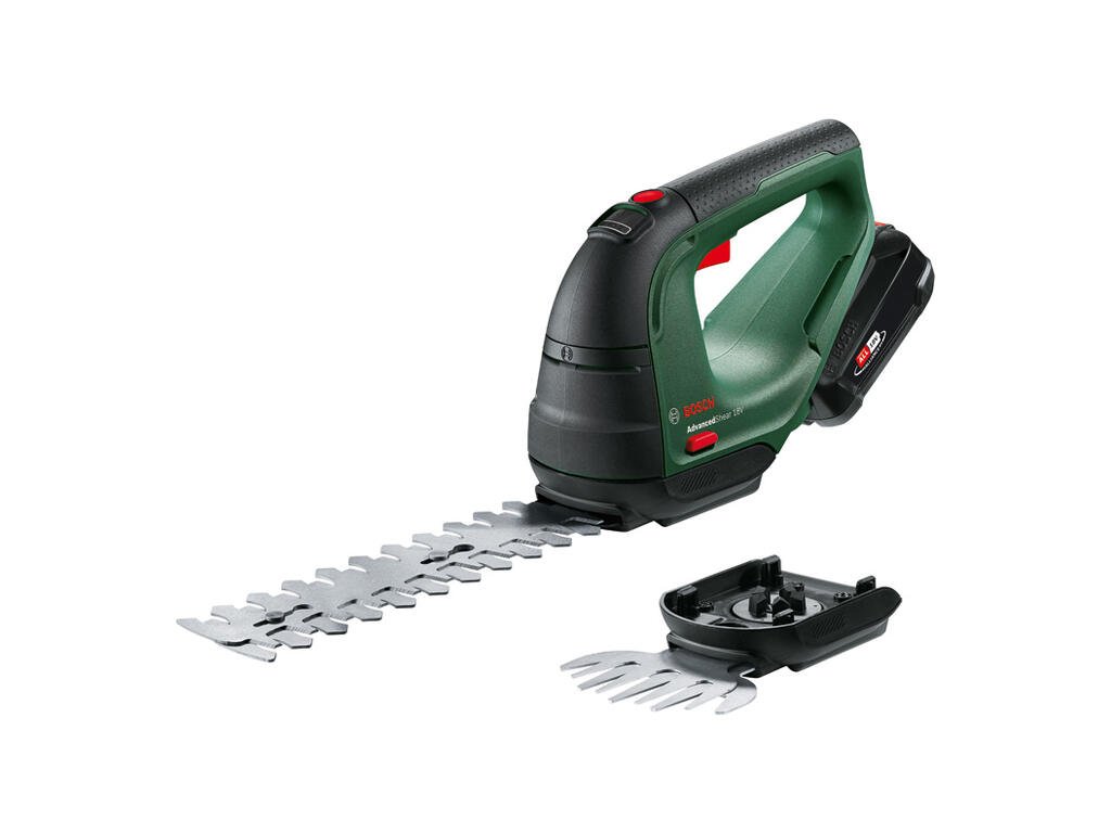 Akumulátorové nožnice na kríky a trávu AdvancedShear 18V-10; Kompaktné rozmery a vysoký výkon: všestranné, výkonné nožnice na trávu a kríky; Flexibilné náradie triedy 18 V s dvoma nožmi na tvarovanie a strihanie; Vysoký výkon v kompaktných rozmeroch: akumulátor a motor 18V POWER FOR ALL; Používanie jednou rukou: ideálne náradie na tvarovanie a strihanie mladých živých plotov, kríkov alebo trávy; Priemerne až 85 štvorcových metrov na jedno nabitie akumulátora; Technológia Syneon reguluje spotrebu energie a zaručuje optimálnu účinnosť a dlhšiu dobu prevádzky; POWER FOR ALL: jeden akumulátor pre celý systém náradia Home & Garden; 1 akumulátor PBA 18V 2.0Ah; Nôž na trávu 100 mm (F 016 800 605); Nôž na živý plot 200 mm (F 016 800 604); Nabíjačka AL 1810 CV; Kartónová škatuľa