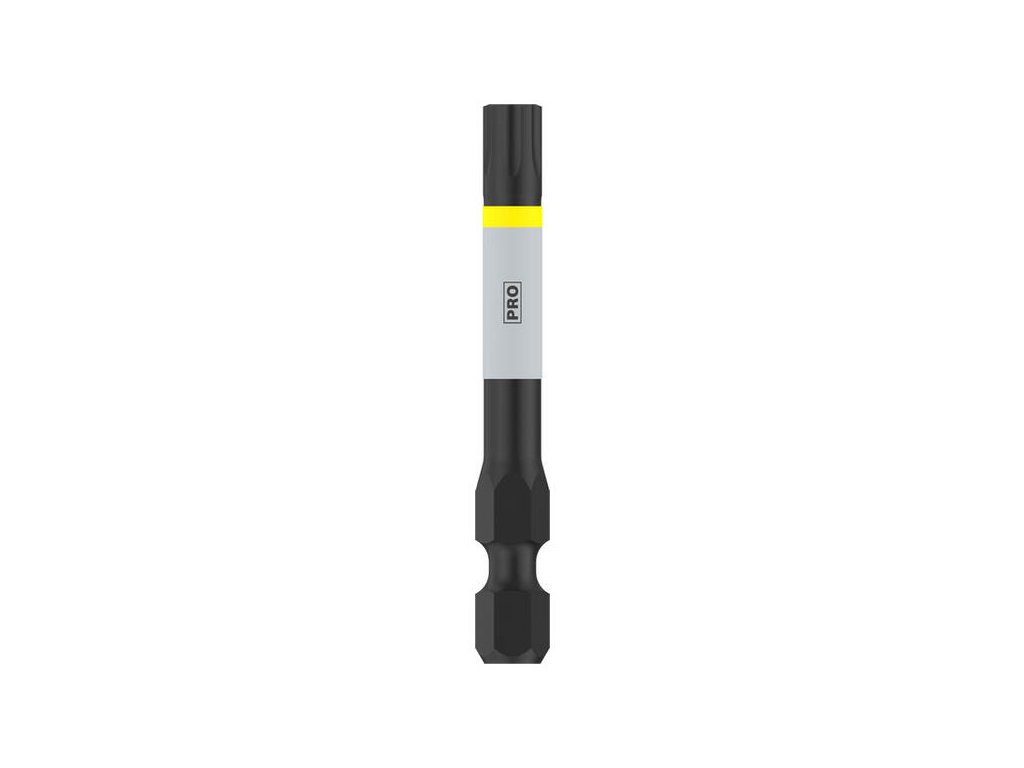 Pre väčšie priemery skrutiek T40 sú tu robustné bity PRO Impact. Sú navrhnuté tak, aby bezpečne prenášali vysoký krútiaci moment z rázového uťahovača na skrutku. Tepelne upravená oceľ zaisťuje dlhú životnosť a odolnosť voči opotrebovaniu.