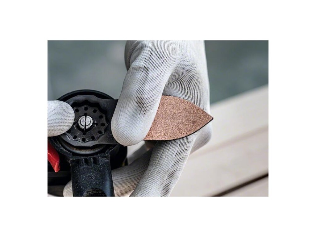 Dlhá životnosť počas brúsenia v tesných medzerách! Tesné škáry v podlahách, okeniciach alebo starých schodiskách sa ručne brúsia naozaj ťažko – a zvyčajne vám do prsta zadrie trieska. Brúsny nadstavec EXPERT Sanding Finger tento druh brúsenia zjednodušuje: tenká, špicatá čepeľ sa vtesná do i tých najmenších medzier a rýchlo a efektívne brúsi pomocou vysokokvalitného karbidového zrna. Brúsne nadstavce EXPERT usporia obrovské množstvo času všetkým, čo potrebujú brúsiť v stiesnených priestoroch. Drsné otvorené zrná RT4 (zrnitosť 40) uberajú materiál ako je farba a upchávajú sa len minimálne, zatiaľ čo jemnejšie zrno RT10 (zrnitosť 100) je ideálne na brúsenie a prípravu čistých drevených povrchov.