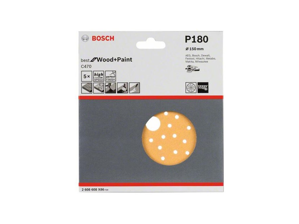 C470 Best for Wood and Paint má vynikajúci úberový výkon. Výrobok má povlak zo stearátu vápenatého, čo znižuje upchávanie. Navyše, jeho otvorený povrch s medzerami medzi elektrostaticky rozptýlenými zrnami zabezpečuje rovnomerné, riadené a konzistentné odstraňovanie prachu. Táto úprava je určená na brúsenie dreva a náterov, napríklad povrchov ako lak, hrubá omietka, tmel, a tiež syntetických a pevných materiálov, ako sú polyméry (Corian, Varicor). Výrobok je vyrobený z papiera C-/B- pokrytého tvrdým zrnom z polodrobivého oxidu hlinitého pre konzistentnú kvalitu. Systém firmy Bosch pre upínanie pomocou suchého zipsu umožňuje rýchlu výmenu a ľahkú manipuláciu.