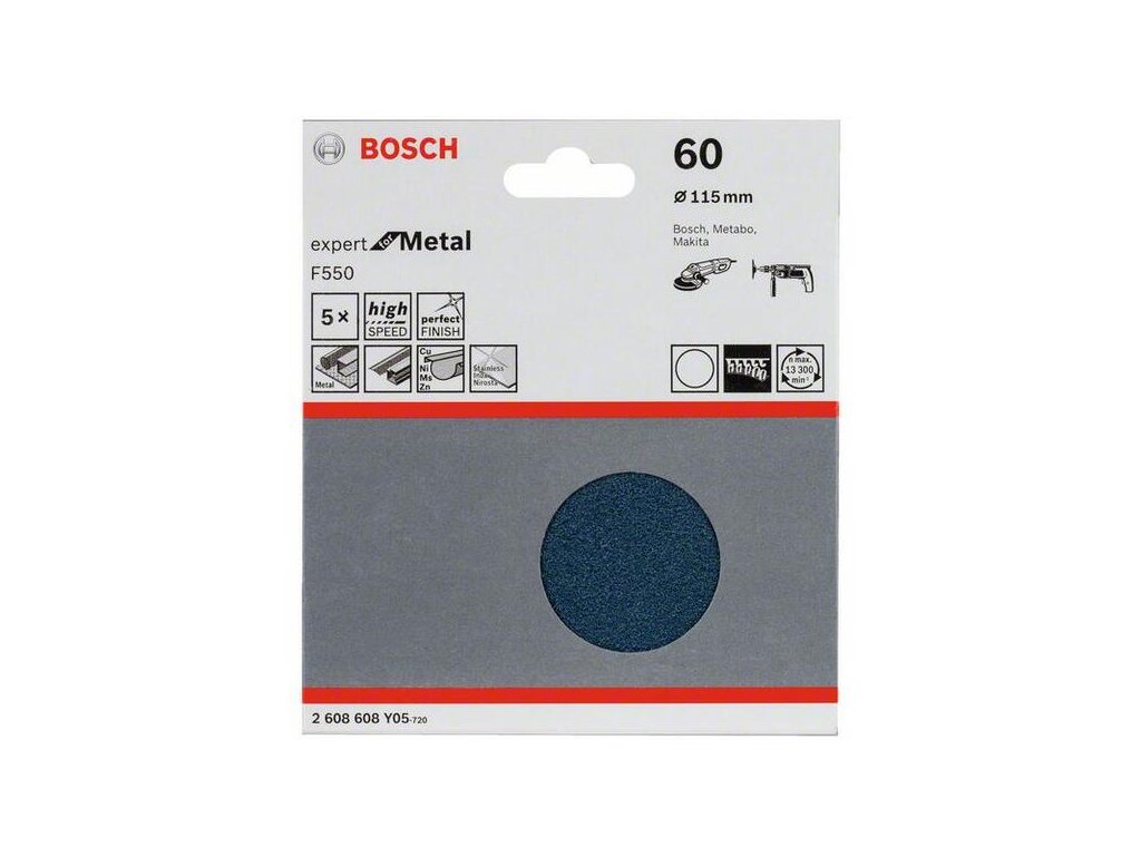 F550 Expert for Metal má vynikajúci úberový výkon na kovových povrchoch. Brúsne zrno zo zmesi kvalitného oxidu zirkoničitého a oxidu hlinitého dáva vynikajúci úberový výkon s vysokou trvácnosťou, ktorá sa blíži k trvácnosti kotúčov so skleným vláknom. Vysoký rotačný úberový výkon navyše umožňuje dosiahnuť požadované výsledky s minimálnou námahou. Vulkanizovaný F-papier je odolný voči opotrebeniu a zaručuje stabilitu v pevných materiáloch. Je určený na suché brúsenie ocele, oceľových zliatin, nerezovej ocele (Inox) a titánu, ako aj zdrsňovanie povrchu a obrusovanie zvarových švov a prechodových spojov. Je tiež ideálny na opracovanie, odstraňovanie ostrapkov, čistenie a odstraňovanie hrdze z povrchov z uhlíkovej ocele, nerezovej ocele, hliníka a neželezných kovov so zameraním na výkon. Má uzatvorene elektrostaticky rozptýlené zrno a chladiace prímesi pre optimálne brúsenie kovových povrchov Brúsne zrno je spojené pomocou plne syntetickej živice na F-papieri z vulkanizovaného vlákna pre odolnosť voči opotrebeniu v náročných aplikáciách. Systém firmy Bosch na upínanie pomocou suchého zipsu s uplatnením priamej sily umožňuje rýchlu výmenu a ľahkú manipuláciu.