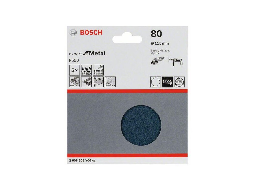 F550 Expert for Metal má vynikajúci úberový výkon na kovových povrchoch. Brúsne zrno zo zmesi kvalitného oxidu zirkoničitého a oxidu hlinitého dáva vynikajúci úberový výkon s vysokou trvácnosťou, ktorá sa blíži k trvácnosti kotúčov so skleným vláknom. Vysoký rotačný úberový výkon navyše umožňuje dosiahnuť požadované výsledky s minimálnou námahou. Vulkanizovaný F-papier je odolný voči opotrebeniu a zaručuje stabilitu v pevných materiáloch. Je určený na suché brúsenie ocele, oceľových zliatin, nerezovej ocele (Inox) a titánu, ako aj zdrsňovanie povrchu a obrusovanie zvarových švov a prechodových spojov. Je tiež ideálny na opracovanie, odstraňovanie ostrapkov, čistenie a odstraňovanie hrdze z povrchov z uhlíkovej ocele, nerezovej ocele, hliníka a neželezných kovov so zameraním na výkon. Má uzatvorene elektrostaticky rozptýlené zrno a chladiace prímesi pre optimálne brúsenie kovových povrchov Brúsne zrno je spojené pomocou plne syntetickej živice na F-papieri z vulkanizovaného vlákna pre odolnosť voči opotrebeniu v náročných aplikáciách. Systém firmy Bosch na upínanie pomocou suchého zipsu s uplatnením priamej sily umožňuje rýchlu výmenu a ľahkú manipuláciu.