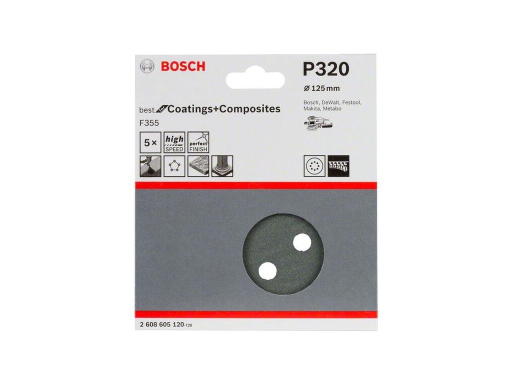 Bosch Brúsny papier F355, 125 mm, P320 pre excentrické brúsky (5ks) 2608605120