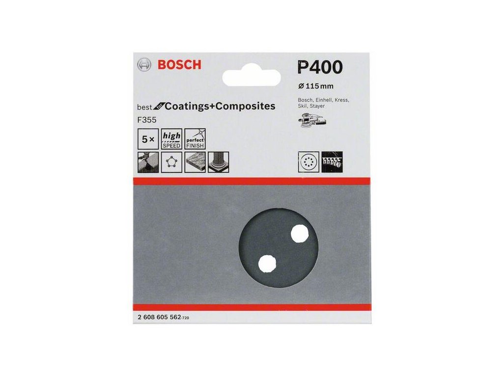 Bosch Brúsny papiere F355, 115 mm, P400 pre excentrické brúsky (5ks) 2608605562