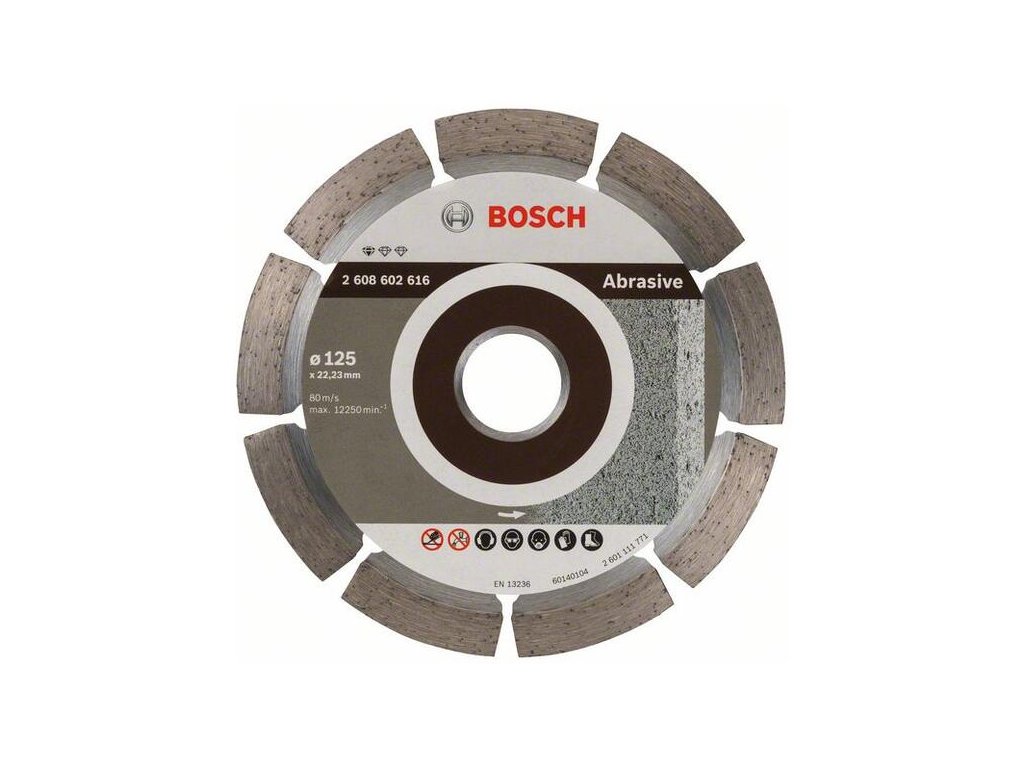 Diamantový rezací kotúč Standard for Abrasive poskytuje spoľahlivé rezy pri práci so všetkými druhmi abrazívnych materiálov. Jeho optimalizovaná diamantová zmes poskytuje vďaka kvalitným štandardom kotúča dôkladné výsledky, ktoré zaručuje kompetenčné centrum Bosch pre diamantové nástroje vo Švajčiarsku. Tento kotúč používajte na rezanie všetkých druhov abrazívnych materiálov.