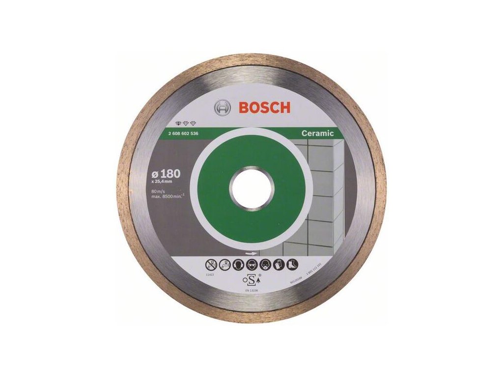 Diamantový rezací kotúč Standard for Ceramic poskytuje spoľahlivé rezy do dlaždíc. Súvislá rezná hrana dosahuje presné výsledky pri práci so všetkými druhmi dlaždíc. Kvalitatívne štandardy kotúča okrem toho zaručuje kompetenčné centrum Bosch pre diamantové nástroje vo Švajčiarsku. Tento kotúč používajte na rezanie do keramiky, porcelánu a jemnej kameniny.