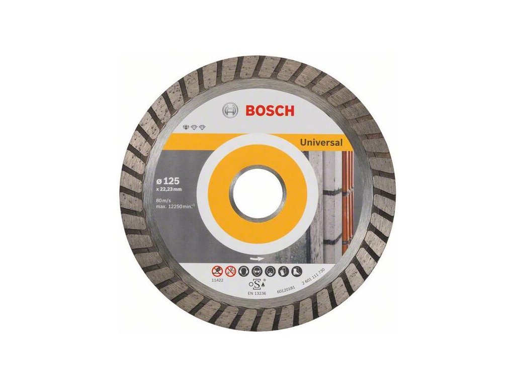 Diamantový rezací kotúč Standard for Universal Turbo poskytuje spoľahlivé rezy do univerzálnych stavebných materiálov. Jeho diamantová zmes je skonštruovaná na rezanie rôznych stavebných prvkov s výsledkom dobre vytvarovaných rezných hrán. Tieto kvalitatívne štandardy zaručuje kompetenčné centrum Bosch pre diamantové nástroje vo Švajčiarsku. Tento kotúč používajte pri rezaní stavebných materiálov, ako sú betón a murivo.
