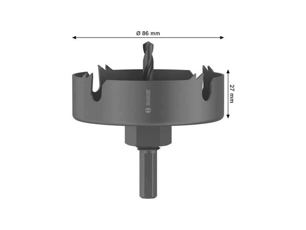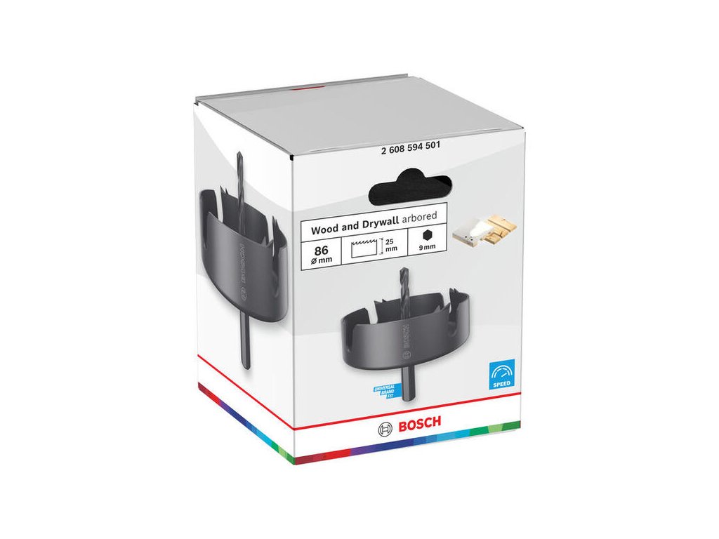 Pre montáž väčších typov osvetlenia je tu dierovka Bosch 86 mm. Vďaka krátkemu telu (27 mm) je práca s ňou bezpečná a stabilná aj pri tomto väčšom priemere. Bimetalové zuby sú navrhnuté tak, aby čisto prerezali papierovú vrstvu sadrokartónu a prešli drevom bez zasekávania.