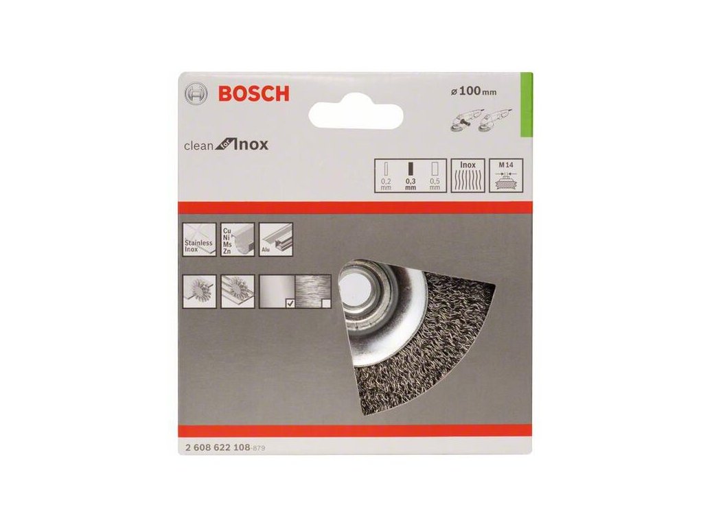 Bosch Drôtená kefa kužeľová vlnitá nehrdzavejúca oceľ nehrdzavejúca D100mm 0,35mm M14 2608622108