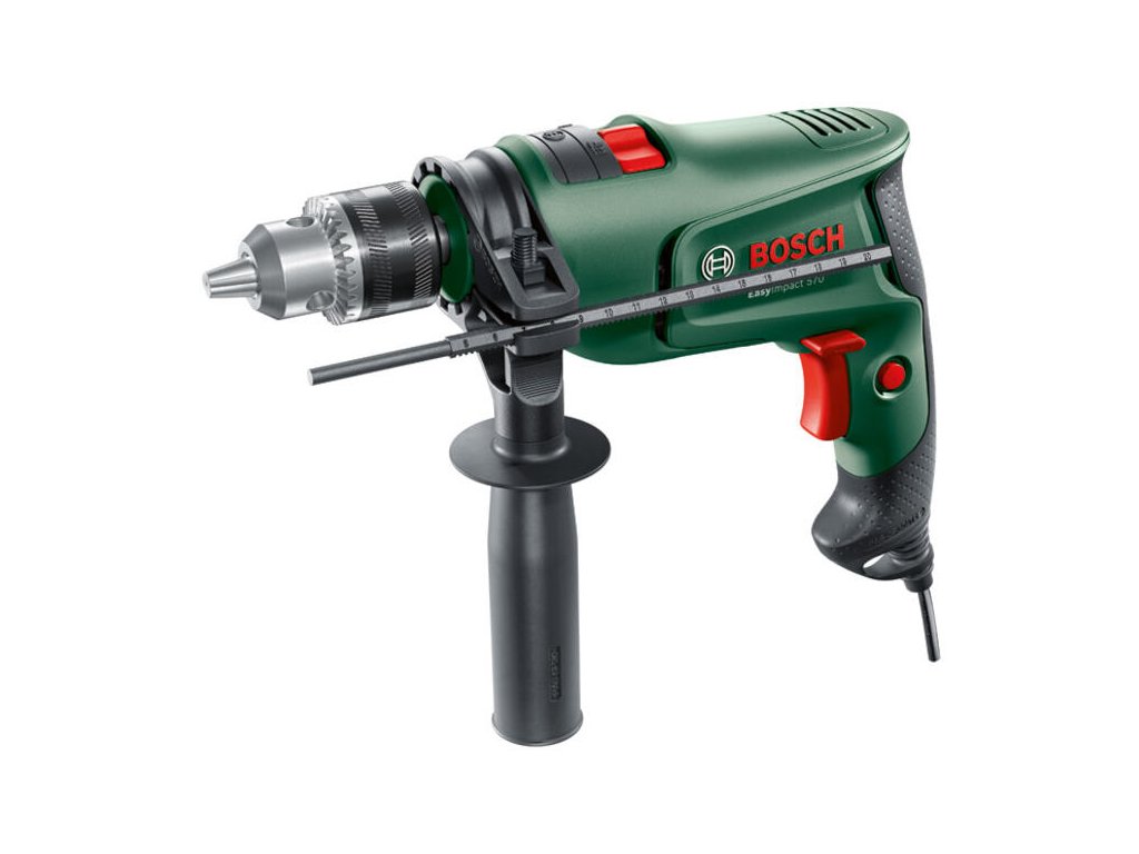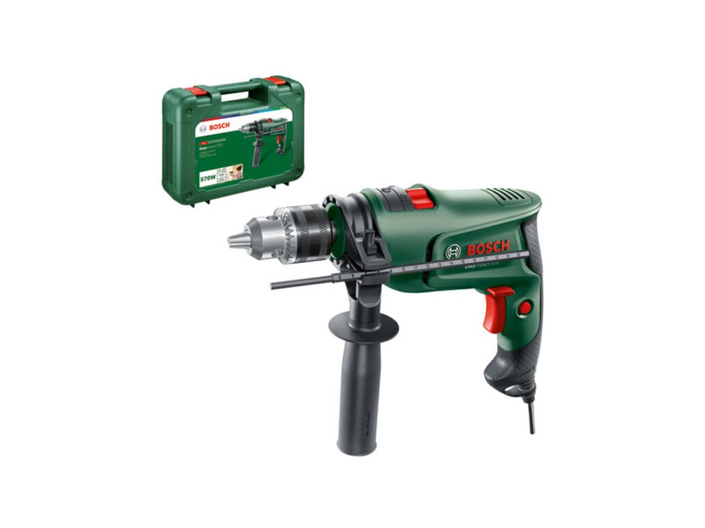 Príklepová vŕtačka EasyImpact 570; Komfortná a kompaktná na vŕtanie bez námahy do rôznych materiálov; Skľučovadlo na tesné uchopenie vrtákov; Regulácia otáčok Bosch Electronic ovládaná spúšťou počas vŕtania; Ľahká, s hmotnosťou 1,7 kg, kompaktná a ergonomická na komfortnú manipuláciu; Ľahké vŕtanie do muriva do 12 mm a dreva do 25 mm; Perfektná pre začiatočníkov na štandardné vŕtanie v dome a záhrade; Prídavná rukoväť; Hĺbkový doraz; Kufor