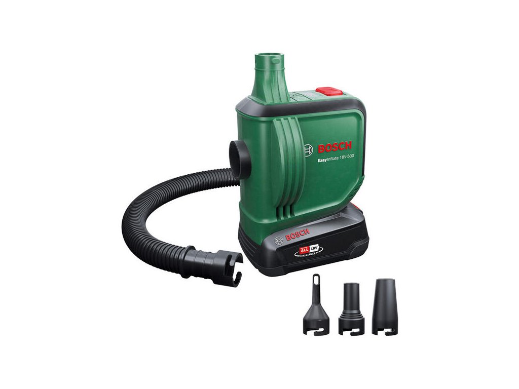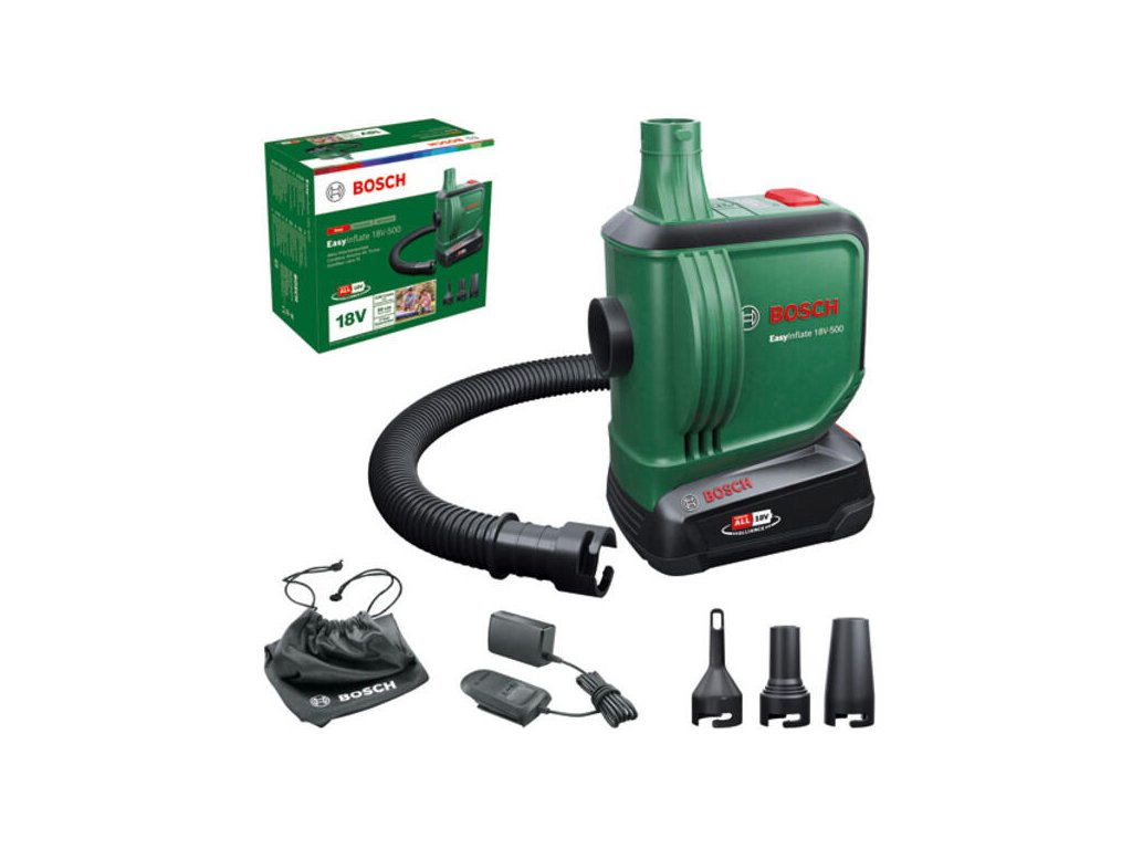Akumulátorový objemový kompresor EasyInflate 18V-500; Komfortné nafukovanie veľkých nafukovacích predmetov; Max. prietok vzduchu 530 l/min na rýchle nafukovanie vzduchových matracov, nafukovacích člnov a detských bazénov; Vypínač na automatické nafukovanie a vypúšťanie vzduchu, 3 dýzy a hadica dĺžky 50 cm; Ľahký, kompaktný a ľahko prenosný na praktické použitie doma aj mimo domova; Vypúšťanie vzduchu vďaka jednoduchému pripojeniu k vypúšťaciemu otvoru; Kompatibilné s akumulátorom Bosch 18V POWER FOR ALL; 1 akumulátor PBA 18V 2.0Ah; 3 vzduchové dýzy; Hadica 50 cm; Textilný vak; Nabíjačka AL 18V-20; V škatuli