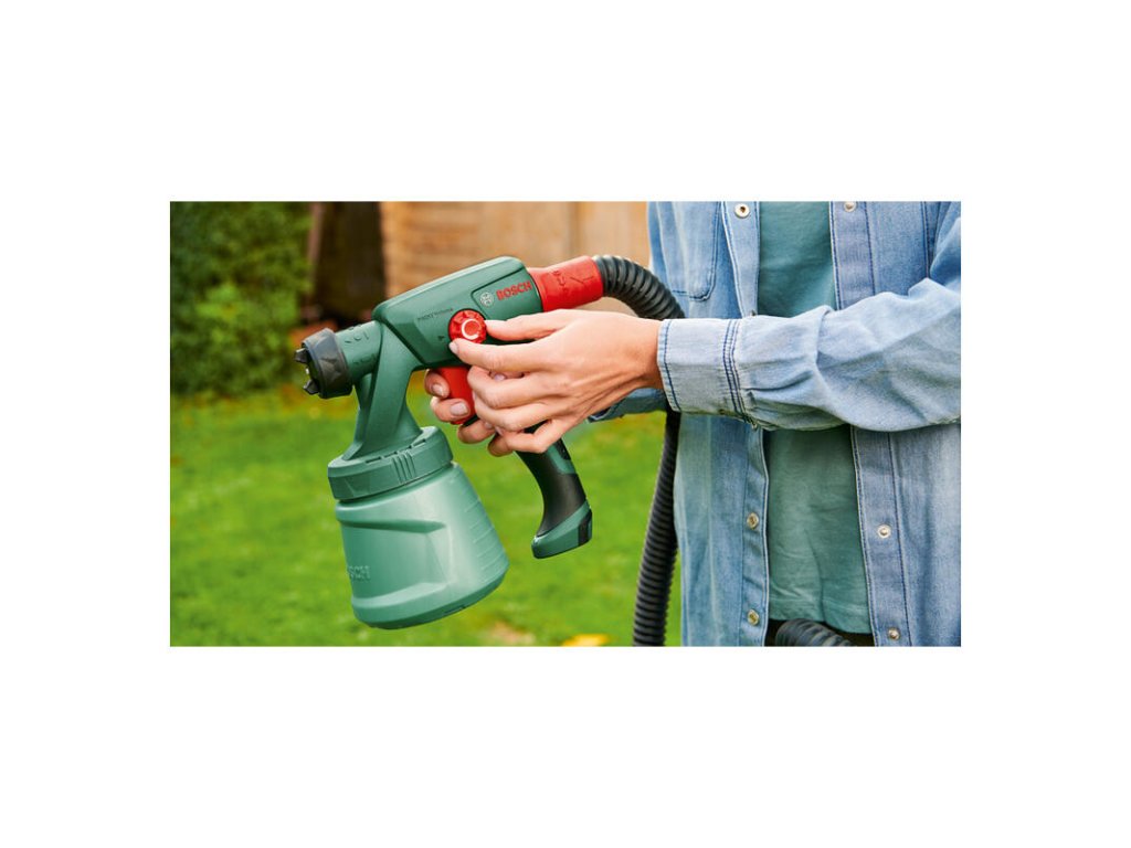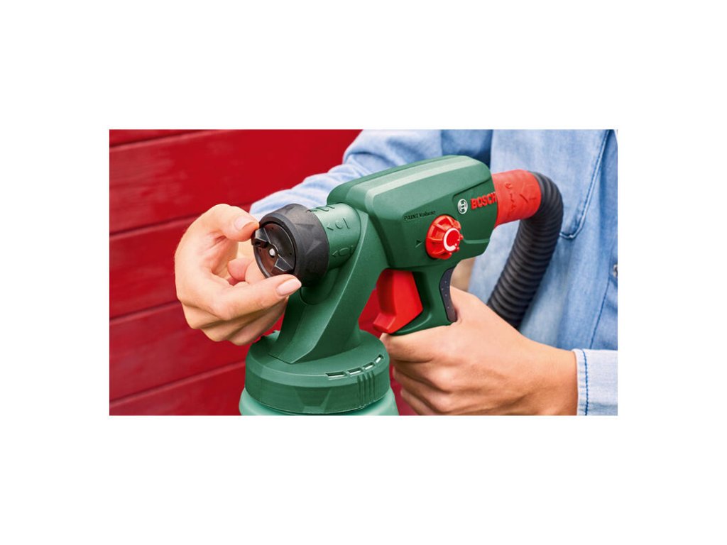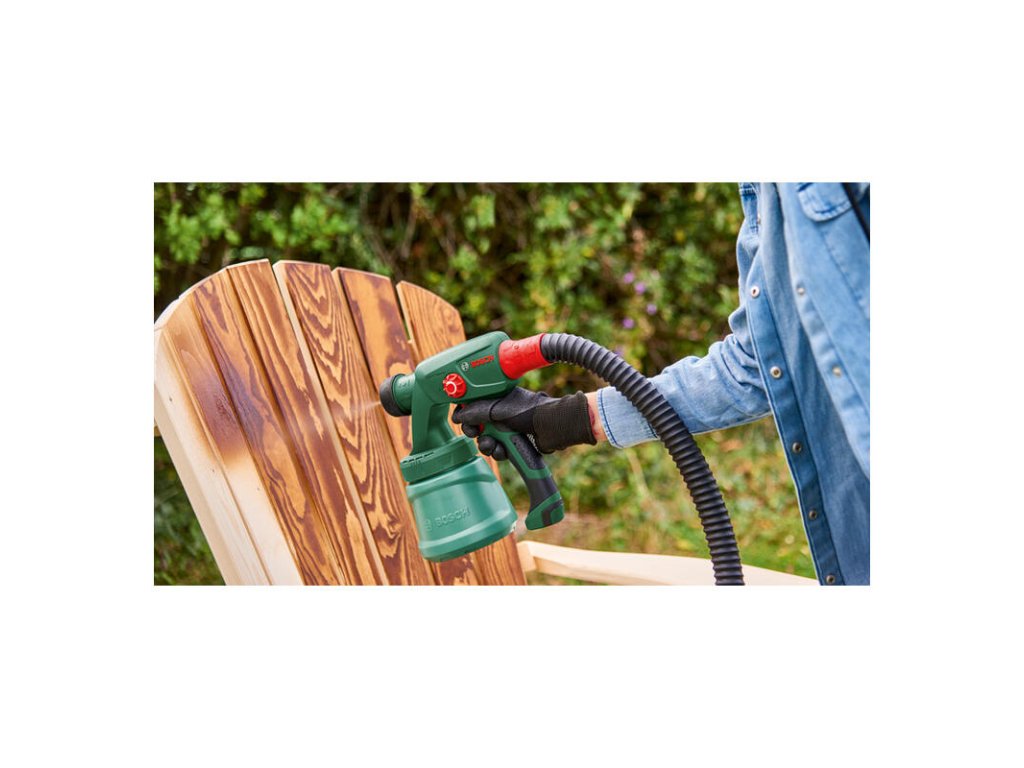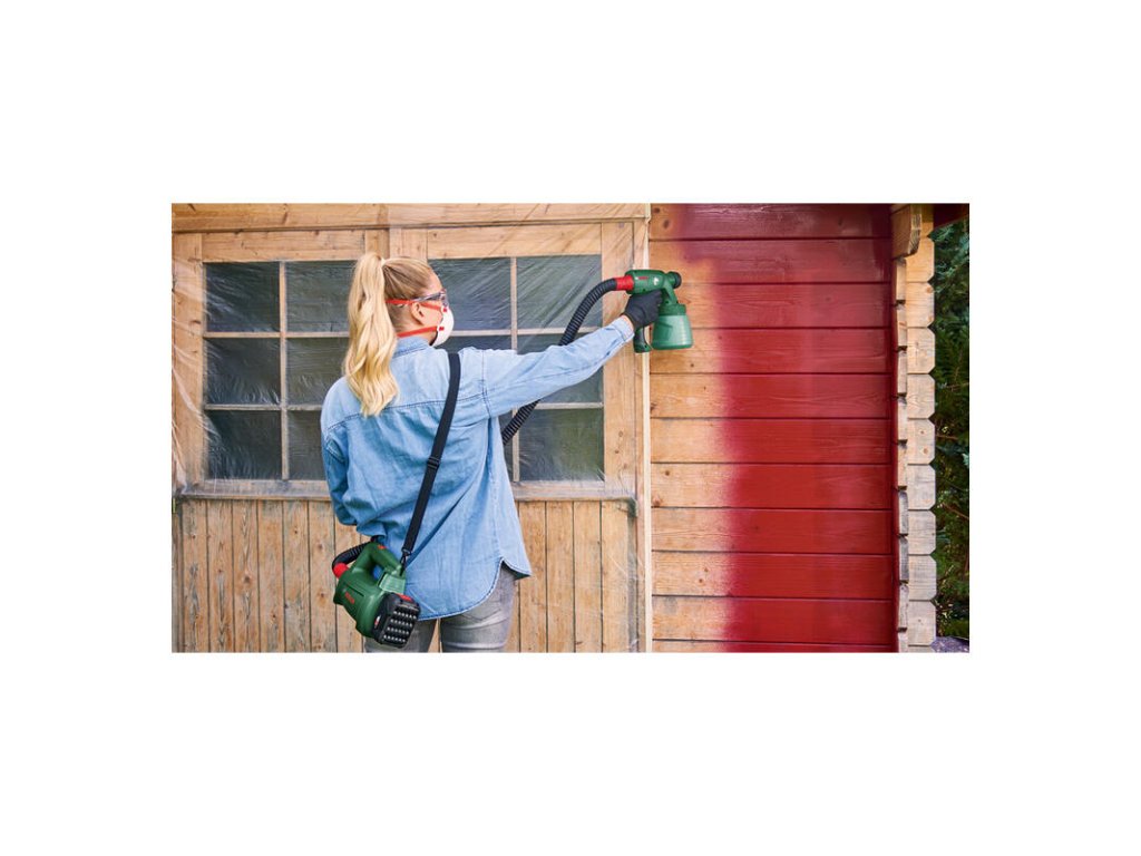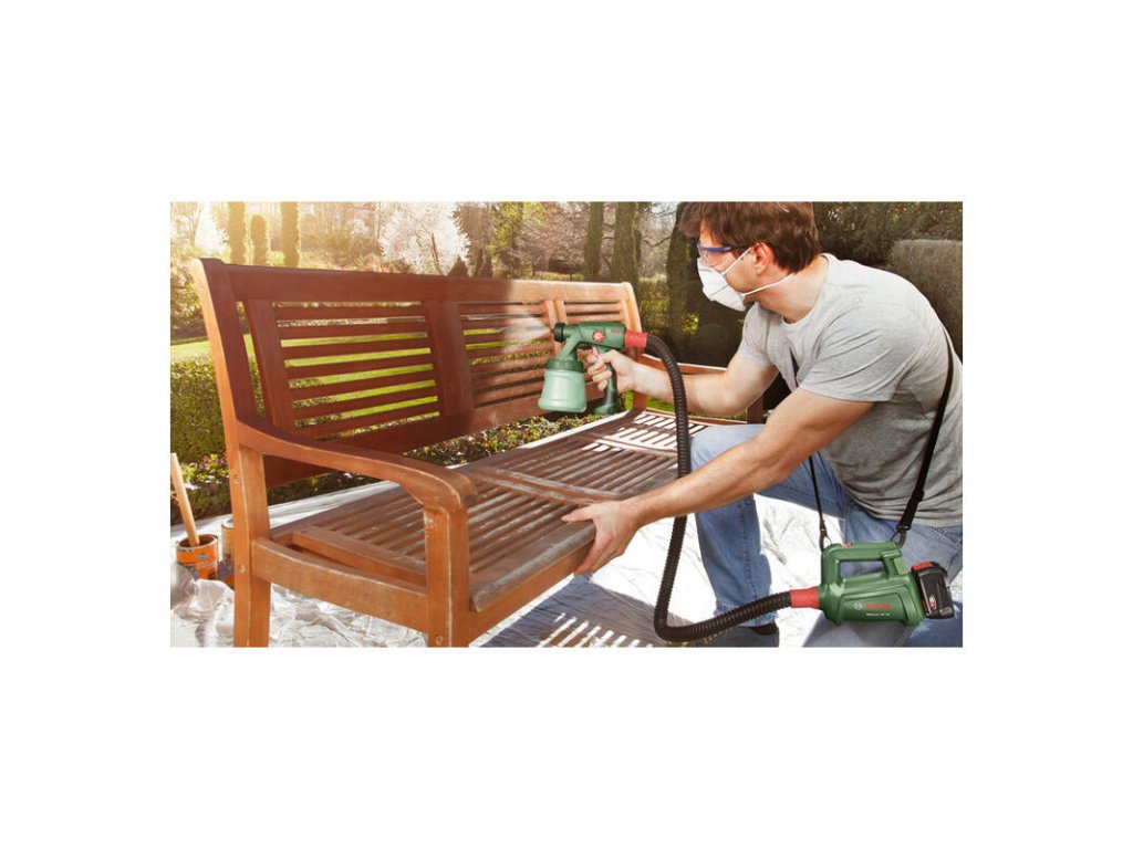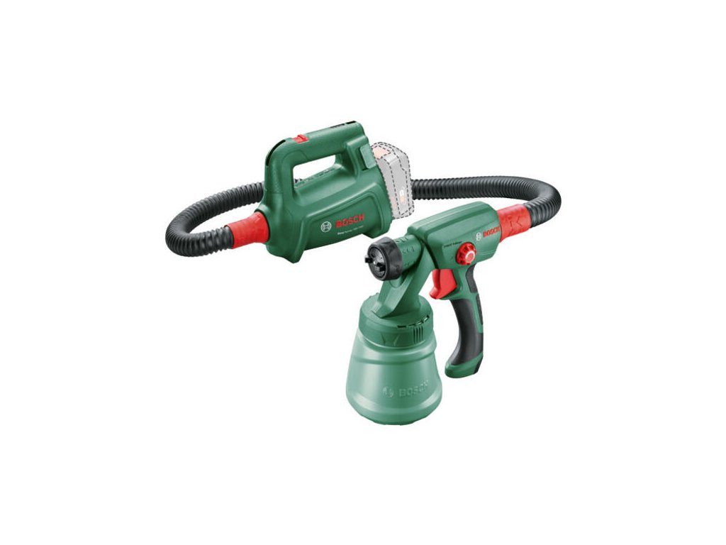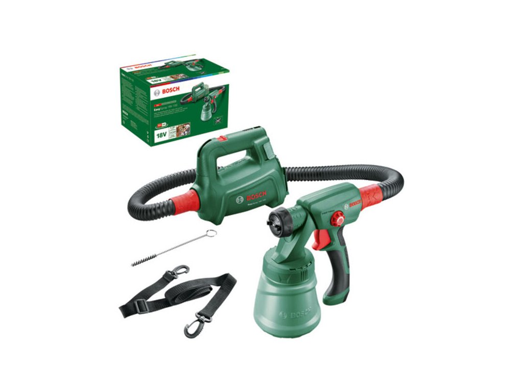 Striekacia pištoľa EasySpray 18V-100; Ľahké a intuitívne striekanie farieb na drevo a kov s vynikajúcimi výsledkami; Ľahká a ergonomická konštrukcia vďaka oddelenej striekacej a tlakovej jednotke; Praktické ovládanie množstva farby EasySelect; Popruh na plece na striekanie bez námahy; Kompatibilné s akumulátorom Bosch 18V POWER FOR ALL; Popruh na rameno; Čistiaca kefa; V škatuli