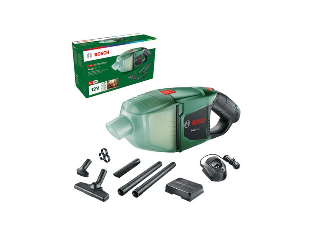 Vysávač na suché vysávanie EasyVac 12; Výkonný akumulátorový ručný vysávač na široký rozsah aplikácií; Prostredníctvom predlžovacích hadíc a podlahovej hubice sa premení na podlahový vysávač; Spoľahlivá výdrž a konštantný sací výkon na jedno nabitie akumulátora; Plisovaný filter a predradený filter chránia vnútorné komponenty pred prachom; Štrbinová hubica na čistenie ťažko dostupných miest; Nadstavec s kefovou hubicou dôkladne čistí koberce a drsné povrchy; POWER FOR ALL: jeden akumulátor pre celý systém náradia Home & Garden; 1 akumulátor PBA 12 V 2,0 Ah; Nabíjačku GAL 1210 CV; Hubica s kefkou (1.619.PA9.896); Štrbinová hubica (1.619.PA9.897); Podlahová hubica (1.619.PA9.899); 2 predlžovacie rúry (1.619.PA9.898); Filtrovacia jednotka (2.607.432.046); Držiak príslušenstva (1.619.PA9.901); V škatuli