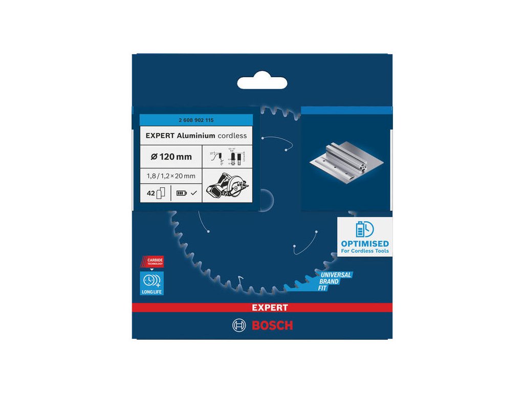 Pre malé akumulátorové píly je tu špeciálny kotúč Bosch EXPERT Aluminium. S priemerom 120 mm a extra tenkým profilom je navrhnutý tak, aby maximalizoval počet rezov na jedno nabitie batérie pri rezaní hliníkových profilov a plechov. Karbidové zuby zaručujú čistý rez.
