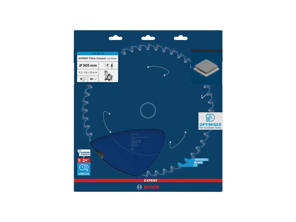 Pre najväčšie akumulátorové pokosové píly a rezanie hrubých cementovláknitých dosiek je tu Bosch EXPERT Fibre Cement 305 mm. 8 zubov z polykryštalického diamantu zaručuje extrémnu životnosť a presnosť. Tenké telo kotúča minimalizuje odpor a predlžuje prácu na batériu.
