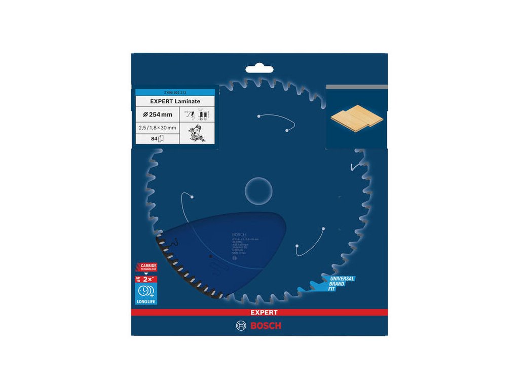 Pre väčšie pokosové píly (254 mm) a dokonalé rezy laminátu. Kotúč Bosch EXPERT Laminate s 84 zubami poskytuje najvyššiu kvalitu rezu, akú môžete pri pokládke podlahy dosiahnuť. Extrémne odolné zuby vydržia dlho ostré aj v abrazívnom materiáli.