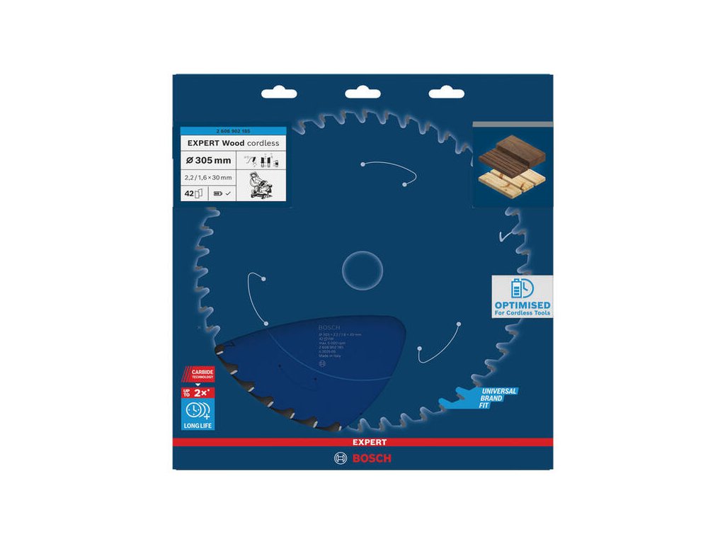 Pre veľké aku píly 305 mm. Kotúč Bosch EXPERT Wood so 42 zubami je univerzálnou voľbou pre rezanie trámov a dosiek. Tenký profil (2,2 mm) znižuje odpor a predlžuje prácu na batériu.
