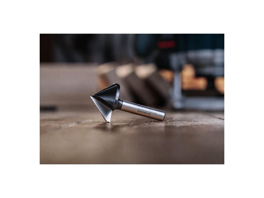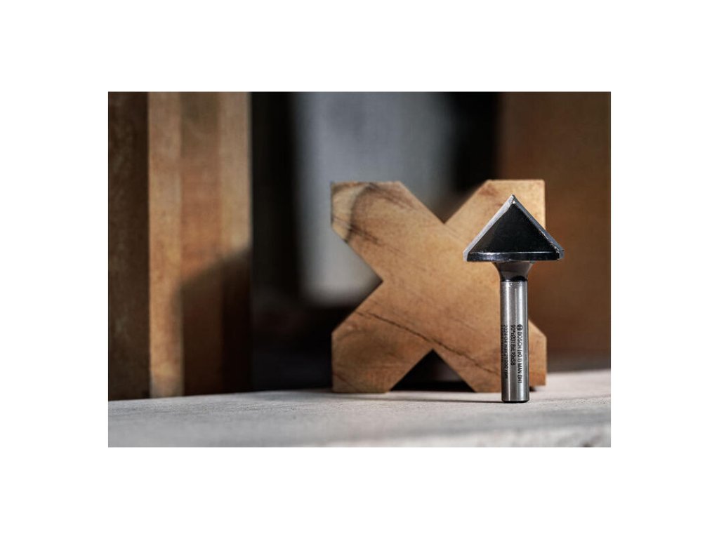 Pre vytváranie okrasných nápisov, skosenie hrán pod uhlom 45 stupňov alebo V-drážok je táto fréza Bosch PRO ideálna. Široký priemer 31,8 mm umožňuje hlboké a výrazné rezy. Karbidové ostrie zaručuje čisté línie aj pri gravírovaní do tvrdého dreva.