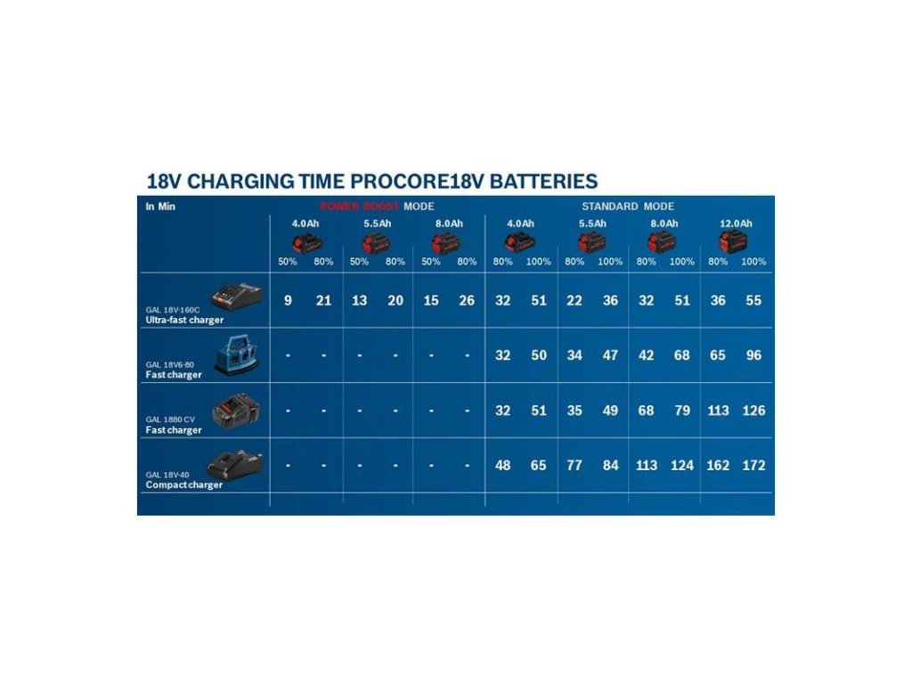- Doba nabíjania ProCORE18V 12.0Ah (80 %/100 %) cca: 65/96 min.