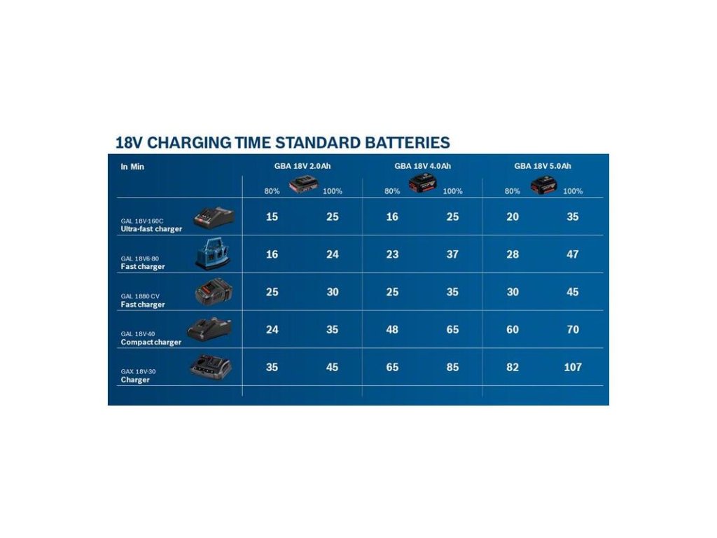 - Doba nabíjania ProCORE18V 4.0Ah (80 %/100 %) cca: 32/50 min.