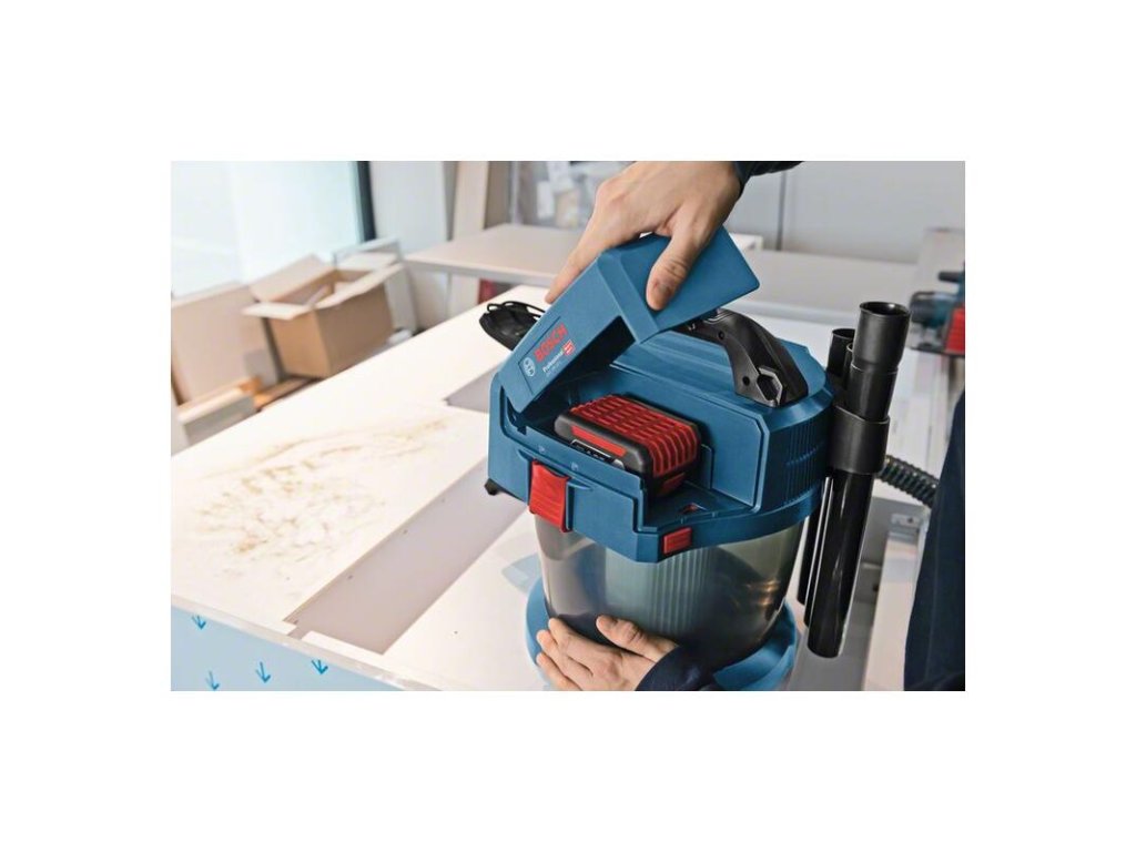 Akumulátorový vysávač GAS 18V-10 L, Inovatívne vysávanie bez káblov: teraz s plným výkonom!, Trvalý sací výkon – dlhší čas vďaka technológii Rotational Airflow Technology, Jednoduchá preprava a manipulácia vďaka ľahkej a kompaktnej konštrukcii a pripojeniu „Click & Clean“, Široké možnosti použitia – bezvreckový systém na suché aj mokré vysávanie a množstvo doplnkov, 1× hadica 1,6 m (2.608.000.658); 1× koleno (2.608.000.659); 3-dielna súprava sacej rúry (2.608.000.660); 1× štrbinová hubica, 250 mm (2.608.000.661); 1× plochý skladaný filter (2.608.000.663); 1× podlahová hubica (2.608.000.707); 1× adaptér na elektrické náradie (2.608.000.708); 1× popruh na plece (2.608.000.706); 4-dielna súprava koliesok (2.608.000.705); Kartónová škatuľa