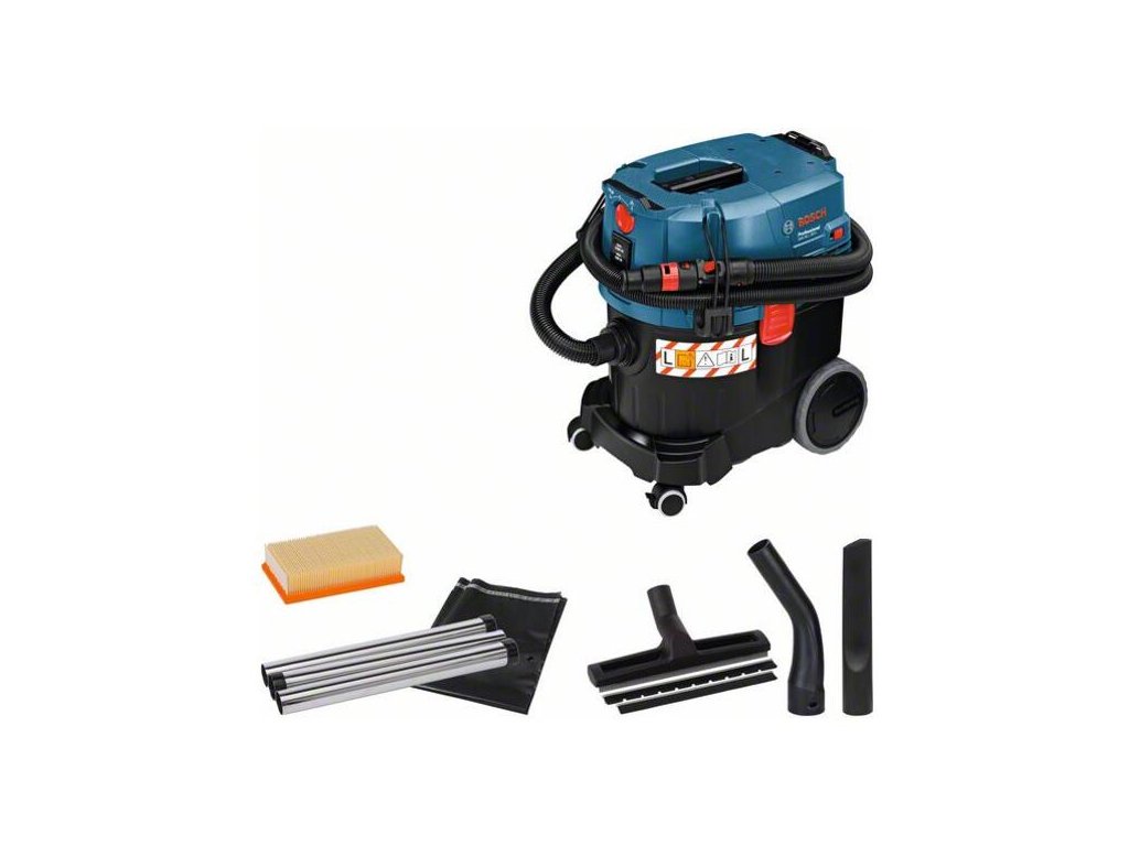 Akumulátorový vysávač GAS 35 L SFC+, Mobilný vysávač na vysávanie namokro/nasucho s najkomfortnejším poloautomatickým čistením filtra, Ako praktické riešenie na transport a odkladanie na mobilné použitie poskytuje možnosť jednoducho hore L-BOXX zacvaknúť, Najkomfortnejšie poloautomatické čistenie filtra (SFC+) len jedným pohybom ruky na rýchly postup práce, Tie najlepšie výsledky odsávacia vďaka 1 200-wattovej sacej turbíne s veľmi vysokým podtlakom až 254 Mbar, 1× plochý skladaný celulózový filter (2.607.432.033); Štrbinová hubica, priemer 35 mm (2.607.000.165); Vrecko na odpad (2.607.432.043); Koleno (2.608.000.573); Súprava podlahových dýz, priemer 35 mm (1.609.390.478); SFC+ modul; Hadica 3 m, Ø 35 mm s objímkou na náradie (2.608.000.569); 3× 0,35 m chrómovaná nasávacia rúra, Ø 35 mm (2.608.000.575)
