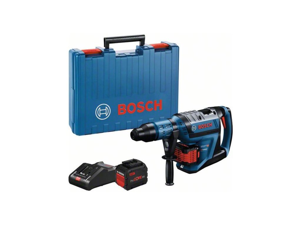 Akumulátorové vŕtacie kladivo BITURBO s SDS max GBH 18V-45 C, Vŕtacie kladivo GBH 18V-45 C Professional poskytuje slobodu s akumulátorom a výkon na úrovni sieťového náradia. Nový vysokovýkonný bezuhlíkový motor a nové akumulátory ProCORE18V poskytujú energiu príklepu 12,5 J a dostatočný výkon aj na najnáročnejšie práce s náradím SDS max. Vysoko optimalizovaná pohonná jednotka súčasne vedie k výraznému zníženiu hmotnosti GBH 18V-45 C; vďaka čomu je náradie ľahšie než porovnateľné elektrické náradie, a to aj s nasadeným akumulátorom ProCORE18V 12.0Ah. Vŕtacie kladivo je vynikajúce na vŕtanie a sekanie do betónu, kameňa a muriva a je kompatibilné so všetkými akumulátormi a nabíjačkami Bosch Professional triedy 18 V. Maximálny výkon s akumulátormi ProCORE18V ≥ 8,0 Ah. 2× akumulátor ProCORE18V 12.0Ah (1.600.A01.6GU); Rýchlonabíjačka GAL 18V-160 C Professional (1.600.A01.9S5); 1× modul Bluetooth Low Energy GCY 42 Professional (1.600.A01.6NH); Prídavná rukoväť (1.607.031.2E7); Tuba s vazelínou (katalógové číslo 1.615.430.010); Kufor na prenášanie; Utierka na náradie