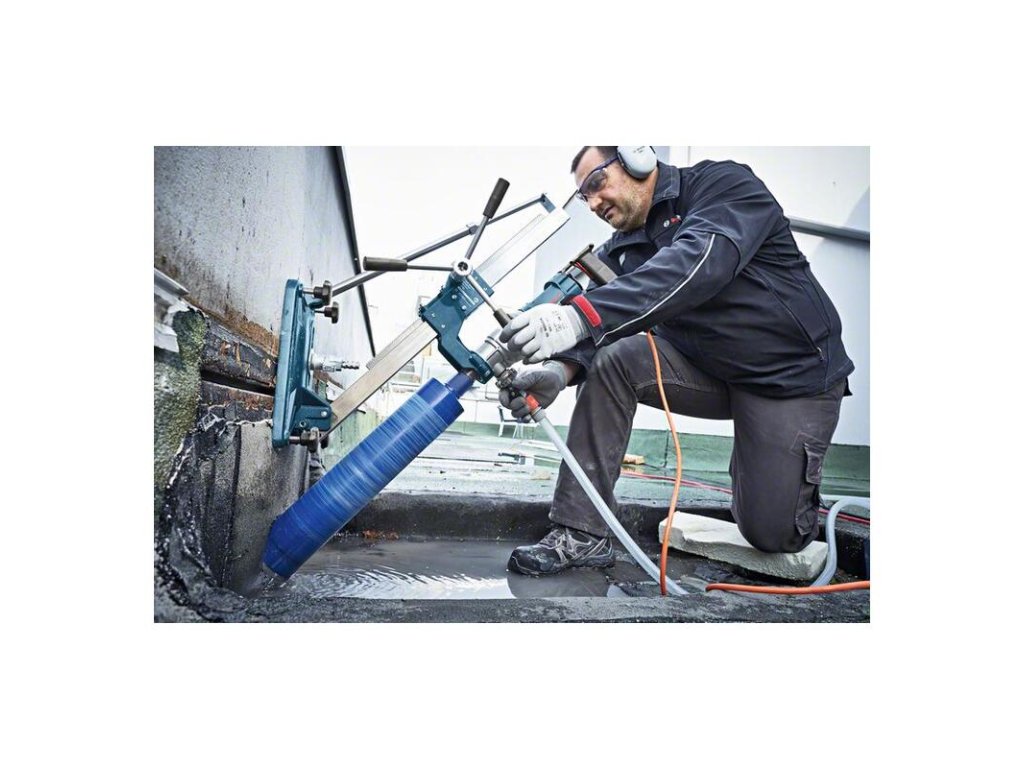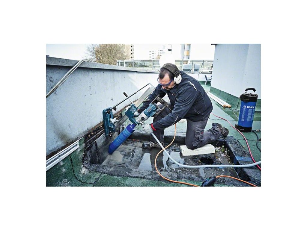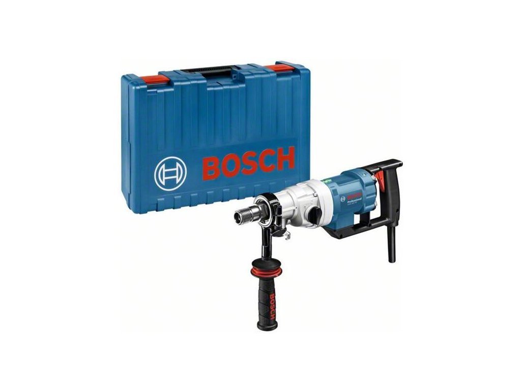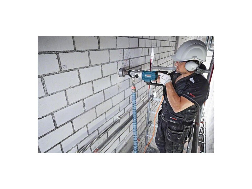 Diamantová vŕtačka GDB 180 WE, Kompaktný silák pre jadrové vŕtanie do 180 mm, Silný 2 000-wattový motor na prerazenie armovaného betónu do 180 mm, Dlhá životnosť vďaka robustnej konštrukcii a prevodovke s olejovým mazaním, Použitie namokro a nasucho; ručné vedenie, ako aj stacionárne vedenie, Odsávací adaptér; Guľový ventil; Kufor na prenášanie