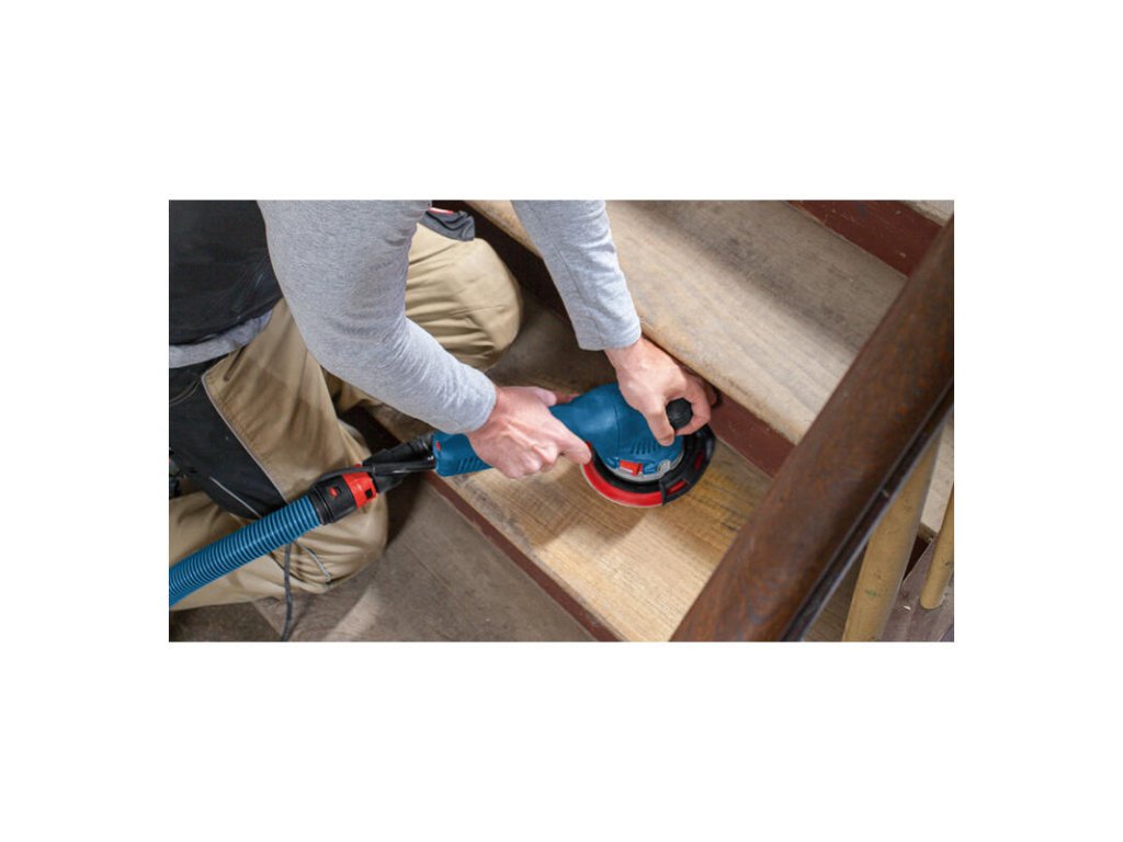 Excentrická brúska GET 75-150, Bosch GET 75-150 Professional je aktívne poháňaná elektrická excentrická brúska s priemerom 150 mm poskytujúca vynikajúce ovládanie a vynikajúcu manipuláciu. Konštrukcia s perfektnou ergonomickou prednou dlaňovou opierkou a rukoväťou s veľmi malým obvodom umožňuje vynikajúce ovládanie náradia. Brúsna doska s množstvom otvorov umožňuje praktické použitie všetkých brúsnych papierov bez ohľadu na množstvo otvorov. Je takisto vybavená extrémne výkonným motorom s príkonom 750 W a aktívnym otáčaním dosky, vďaka čomu poskytuje vynikajúci úber. Táto elektrická brúska je určená ná základné brúsenie, priebežné brúsenie, odstraňovanie náterov, záverečné spracovanie a leštenie povrchov. Možno ju použiť na drevo, dyhu, nátery, tmely, ako aj minerálne či akrylové povrchy. Je kompatibilná so systémom na odsávanie prachu Bosch Click & Clean. Kartónová škatuľa; Brúsny tanier (150 mm) (2.608.601.335); 1× brúsny list M480, Best for Wood and Paint, 120 (dostupný samostatne ako súprava 5 kusov: 2.608.621.164); Ochranný prstenec na 150 mm (2.607.017.497); Prídavná rukoväť vrátane skrutky (2.607.017.500); Sacia objímka na 150 mm (2.607.017.499); Šesťhranný kolíkový kľúč