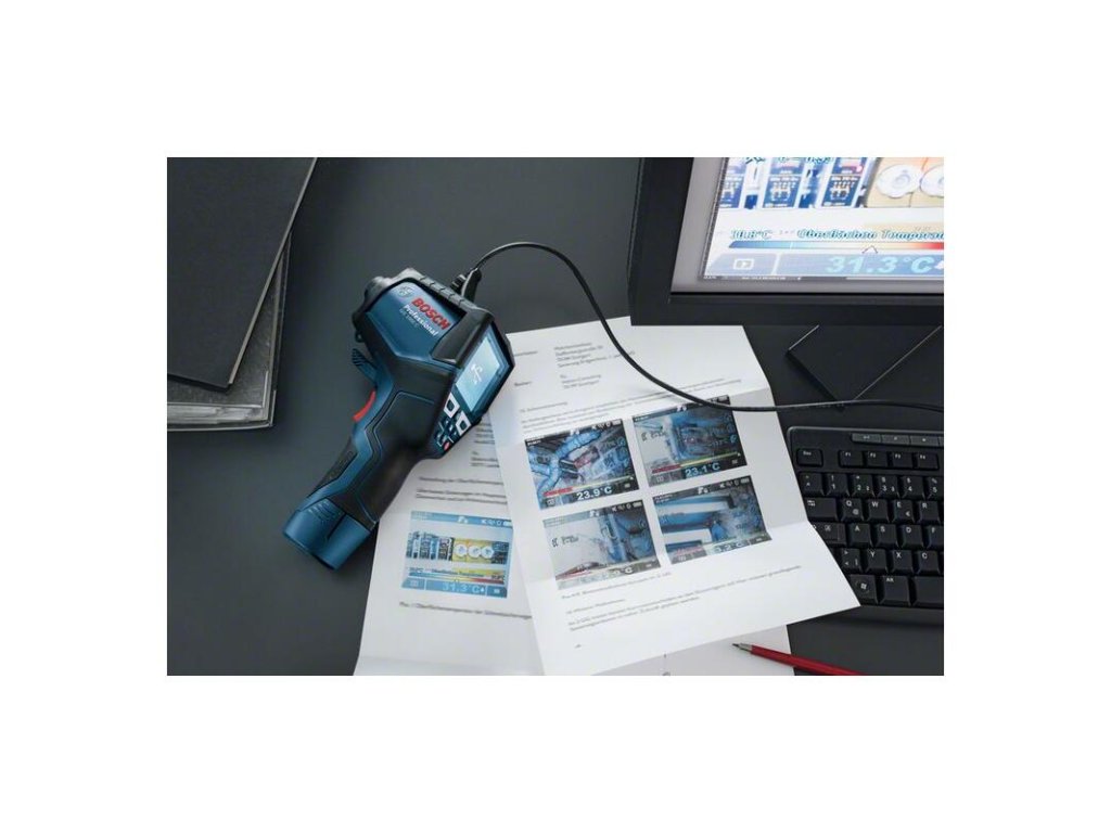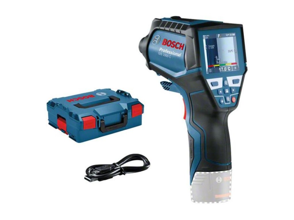 Detektor teploty GIS 1000 C, Detektor teploty GIS 1000 C Professional je rýchle riešenie na presné meranie a dokumentáciu teplôt a relatívnej vlhkosti. Integrovaný fotoaparát prístroja pri zázname meraní prakticky zaznamenáva snímky na okamžité zobrazenie s príslušnými hodnotami. Podrobné údaje sa dokumentujú rýchlo a možno ich zdieľať do vzdialených zariadení vďaka aplikácii Bosch ThermalOn prostredníctvom pripojenia Bluetooth®. Tento detektor teploty umožňuje záznam teplôt, ponúka pracovníkom päť rôznych režimov na komplexné meranie povrchovej a kontaktnej teploty (s integrovanou funkciou termočlánku typ K), výpočtom rosného bodu a tepelného mosta a používateľským režimom na vlastné hodnoty. Profesionáli môžu používať detektor teploty na množstvo prác od zisťovania rizika plesní až po kontrolu tepelných mostov, ako aj na presné kontaktné meranie odrazivých povrchov, kvapalín a priame meranie teploty vzduchu. Spolu s meraním povrchovej teploty a kontaktnej teploty umožňuje priestorový senzor prístroja GIS 1000 C Professional aj rýchle monitorovanie okolitých podmienok na presné meranie teploty v miestnosti a relatívnej vlhkosti a dokonca mnohé ďalšie možnosti použitia. Prehľadné používateľské rozhranie umožňuje intuitívne ovládanie a získavanie veľmi presných výsledkov širokého rozsahu meraní. GIS 1000 C Professional nie je vhodný na použitie v zdravotníctve. L-BOXX 136 (1.600.A01.2G0); Vložka L-BOXX na náradie; Quickstart karta; Kábel Micro USB (2.609.120.670)