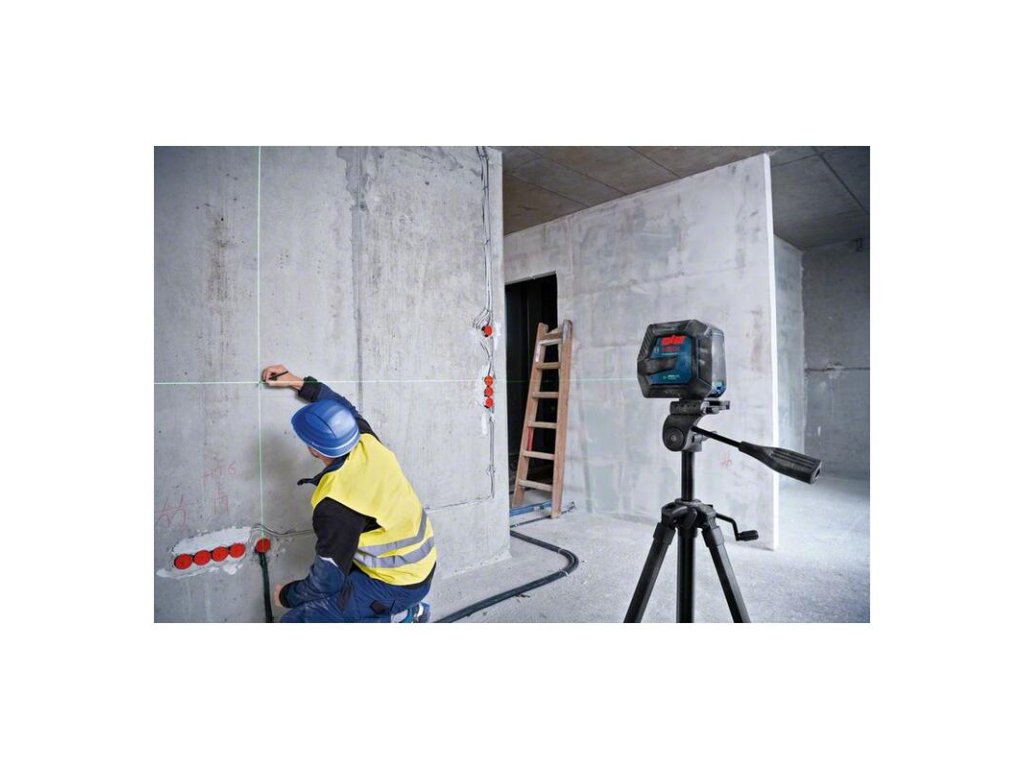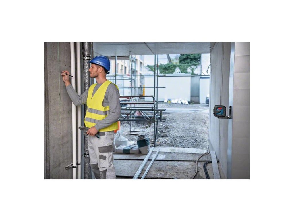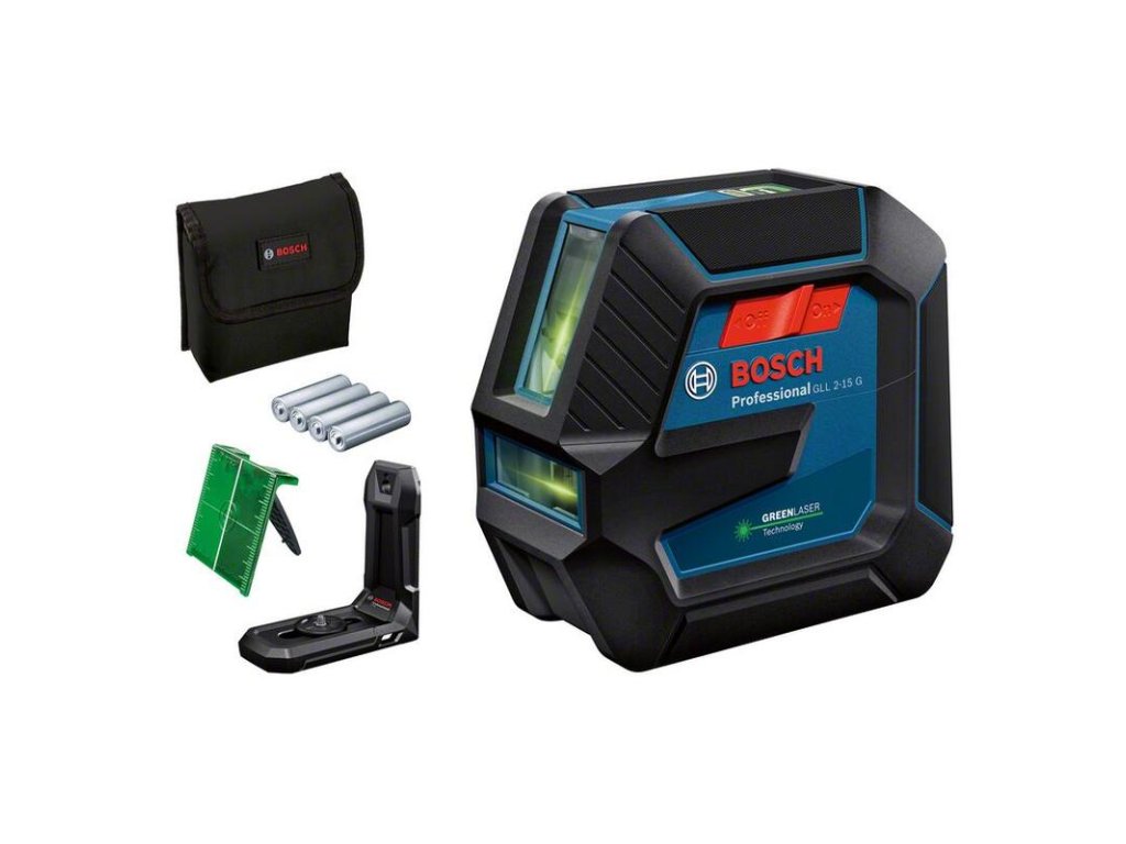 Líniový laser GLL 2-15 G, Odolný líniový laser GLL 2-15 G Professional je jednoduchým prístrojom na dosiahnutie presných výsledkov. Môžete sa naplno sústrediť na prácu vďaka odolnej konštrukcii, pogumovanému krytu poskytujúcemu lepšiu ochranu priezorov a ochranu proti prachu a fŕkajúcej vode na úrovni IP 64. Hlavný vypínač a jednotlačidlové ovládanie uľahčujú používanie. Vertikálna a horizontálna zelená laserová línia zvyšuje viditeľnosť v jasnejšom prostredí. Využívajte praktické, rýchle a bezpečné upevnenie vďaka príslušenstvu LB 10 Professional s veľmi silnými magnetmi. Príslušenstvo LB 10 Professional je kompatibilné s voliteľnou stropnou svorkou DK 10 Professional na upevnenie na strop alebo jemné nastavenie výšky. Tento líniový laser je vynikajúcou voľbou na prácu v krátkom pracovnom rozsahu, napr. inštaláciu závesných stropných podhľadov, montáž políc, inštaláciu odpadových potrubí a vyrovnávanie svietidiel. GLL 2-15 G Professional poskytuje pracovný rozsah až do 15 m a rozsah samonivelizácie až ±4° za menej než 4 sekundy. Univerzálny držiak LB 10 Professional; Laserová cieľová platnička; Taška; 4× batéria 1,5 V LR6 (AA)