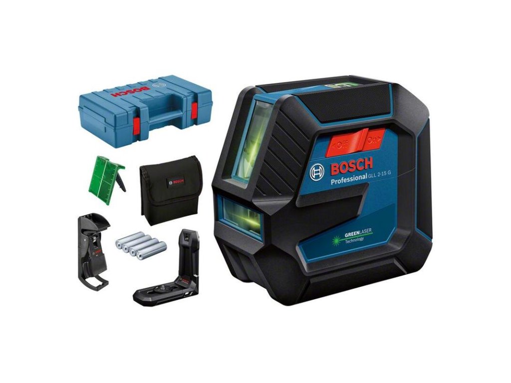 Líniový laser GLL 2-15 G, Odolný líniový laser GLL 2-15 G Professional je jednoduchým prístrojom na dosiahnutie presných výsledkov. Môžete sa naplno sústrediť na prácu vďaka odolnej konštrukcii, pogumovanému krytu poskytujúcemu lepšiu ochranu priezorov a ochranu proti prachu a fŕkajúcej vode na úrovni IP 64. Hlavný vypínač a jednotlačidlové ovládanie uľahčujú používanie. Vertikálna a horizontálna zelená laserová línia zvyšuje viditeľnosť v jasnejšom prostredí. Využívajte praktické, rýchle a bezpečné upevnenie vďaka príslušenstvu LB 10 Professional s veľmi silnými magnetmi. Príslušenstvo LB 10 Professional je kompatibilné s voliteľnou stropnou svorkou DK 10 Professional na upevnenie na strop alebo jemné nastavenie výšky. Tento líniový laser je vynikajúcou voľbou na prácu v krátkom pracovnom rozsahu, napr. inštaláciu závesných stropných podhľadov, montáž políc, inštaláciu odpadových potrubí a vyrovnávanie svietidiel. GLL 2-15 G Professional poskytuje pracovný rozsah až do 15 m a rozsah samonivelizácie až ±4° za menej než 4 sekundy. Univerzálny držiak LB 10 a svorka na strop DK 10 Professional (0.601.092.C00); Laserová cieľová platnička; Taška; 4× batéria 1,5 V LR6 (AA); Kufor na prenášanie