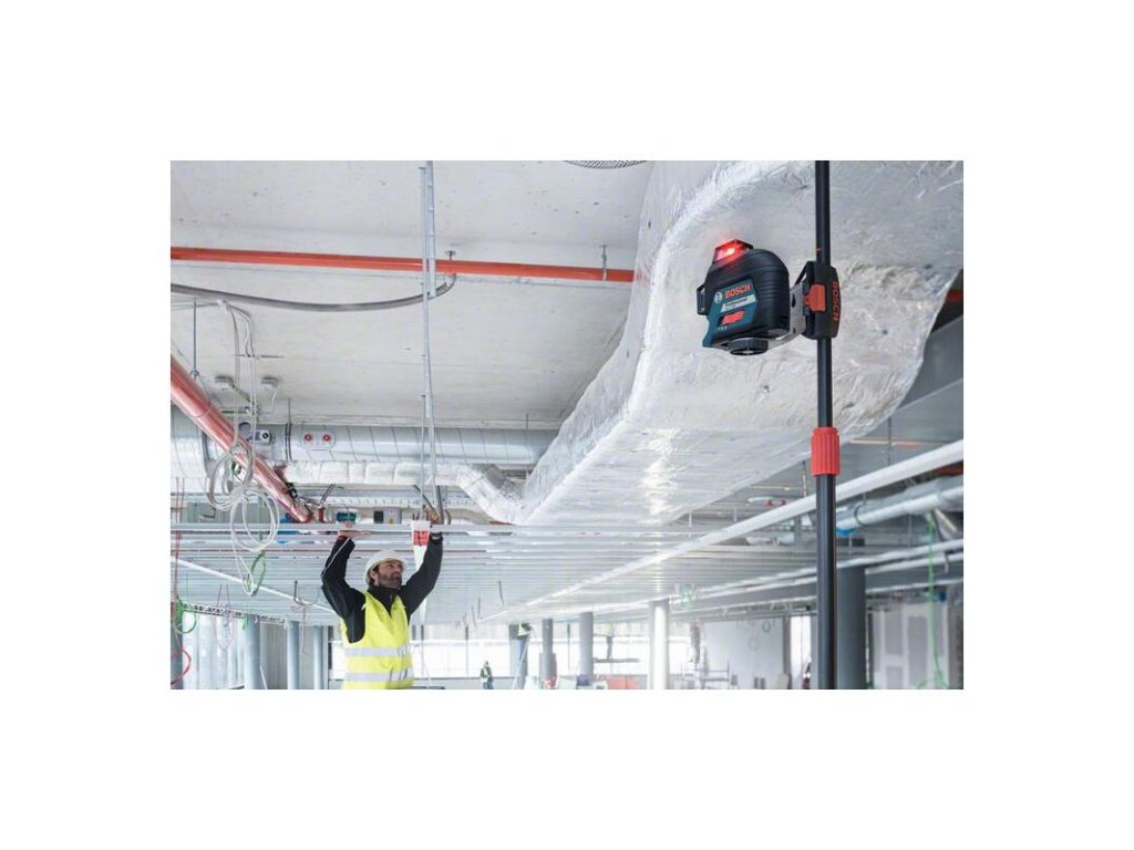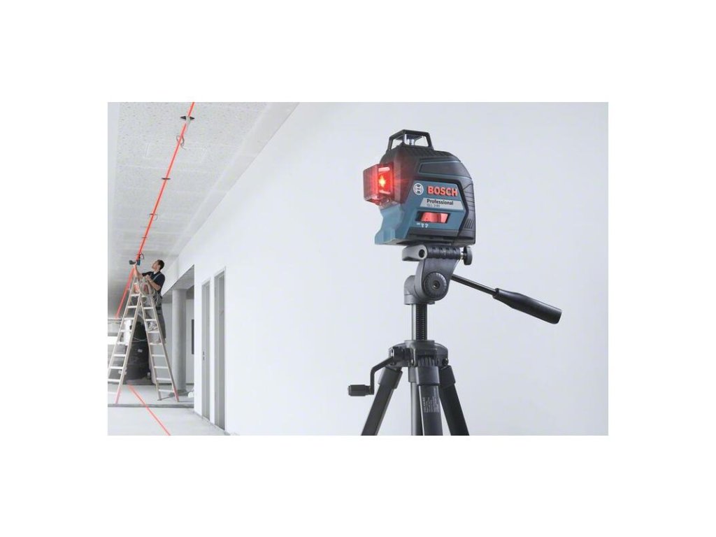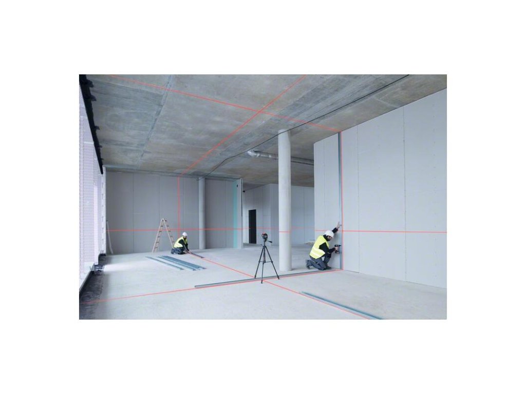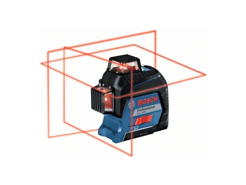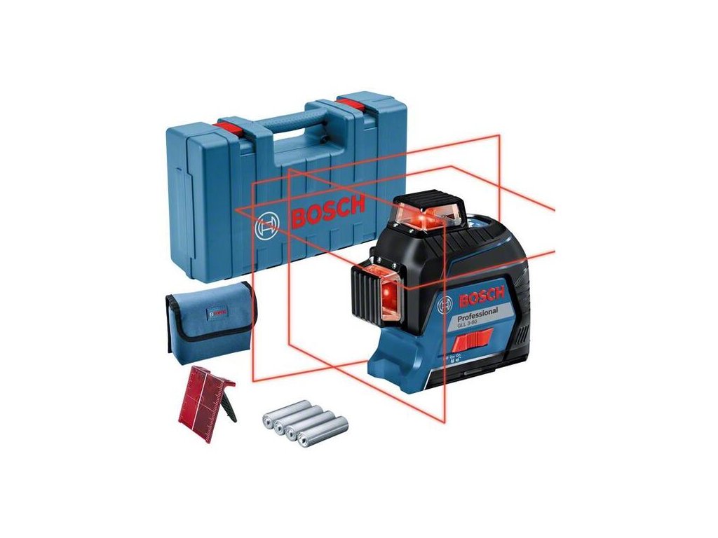 Líniový laser GLL 3-80, Líniový laser GLL 3-80 Professional premieta 3 línie v rozsahu 360° a poskytuje vyššiu úroveň viditeľnosti. Vysokovýkonné diódy zaručujú vysoký vizuálny jas. 3 línie s rozsahom 360° tohto náradia na súčasné horizontálne a vertikálne vyrovnávacie práce po celej miestnosti umožňujú veľmi efektívnu prácu, intuitívne používateľské rozhranie zaisťuje jednoduché ovládanie. Tento líniový laser je určený na montáž podvesených podhľadov, realizáciu podláh, montáž okien, montáž políc, kladenie odpadových potrubí, montáž konštrukcií suchej výstavby a kladenie dlažieb a obkladov. GLL 3-80 Professional je vynikajúci prístroj na rýchlu samonivelizáciu a ustáli sa na nerovných povrchoch až do ±4° za menej než 4 sekundy s excelentnou presnosťou ±0,3 mm/m*/**. S voliteľným prijímačom LR 6 alebo LR 7 Professional má pracovný dosah až do 120 m. Tento líniový laser je kompaktný, ľahko použiteľný a extrémne robustný (IP54). 4× batéria 1,5 V LR6 (AA); Laserová cieľová platnička; Taška; Kufor na prenášanie